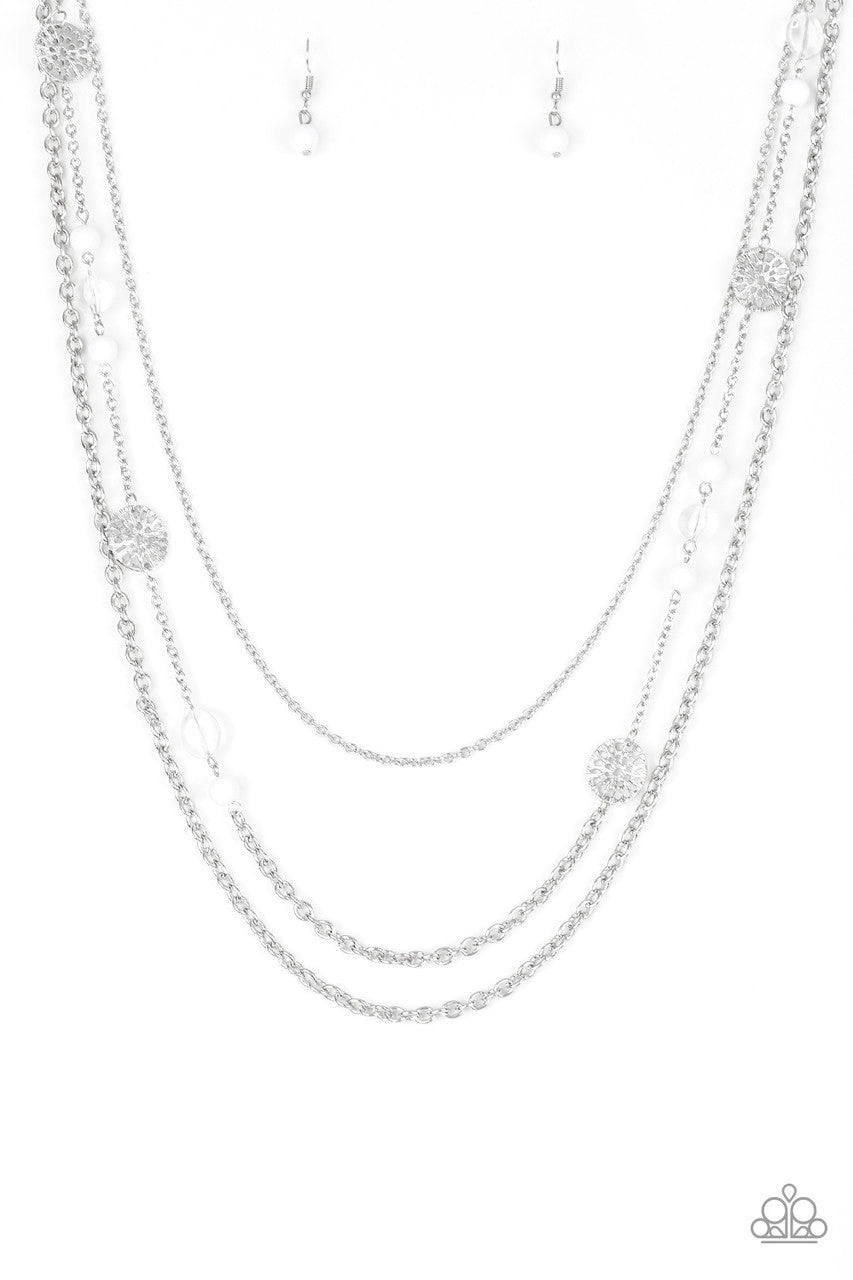 Ornate silver accents, glassy beads, and polished white beads trickle along strands of shimmery silver chains for a whimsical look. Features an adjustable clasp closure.