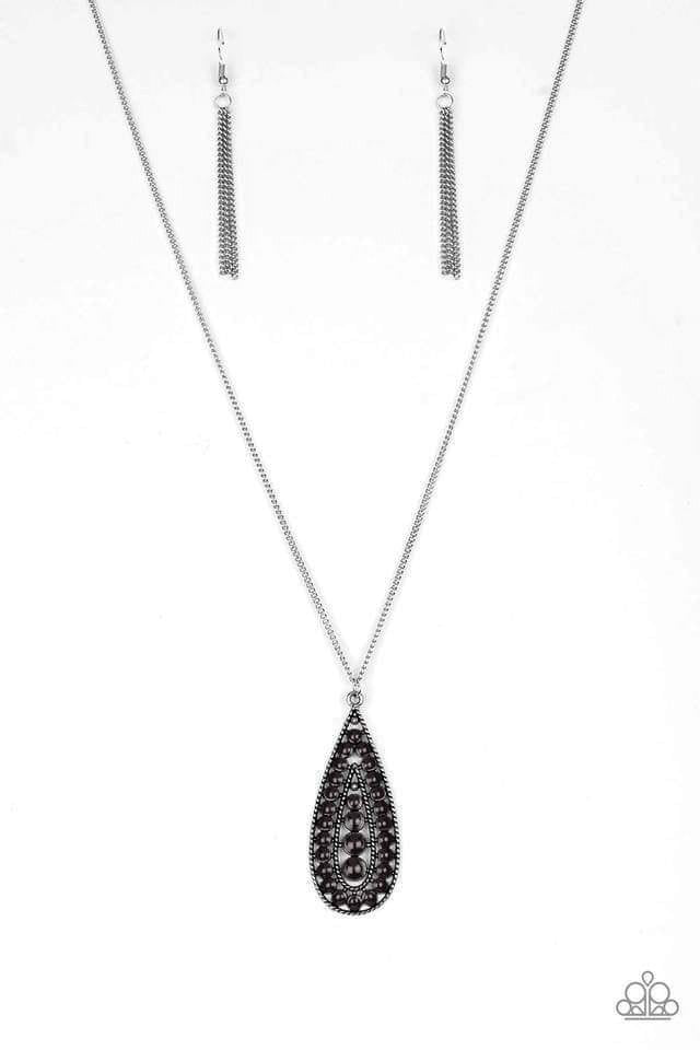 Brushed in a black finish, a bubbly silver teardrop swings from the bottom of an elongated silver chain for a tribal inspired look. Features an adjustable clasp closure.