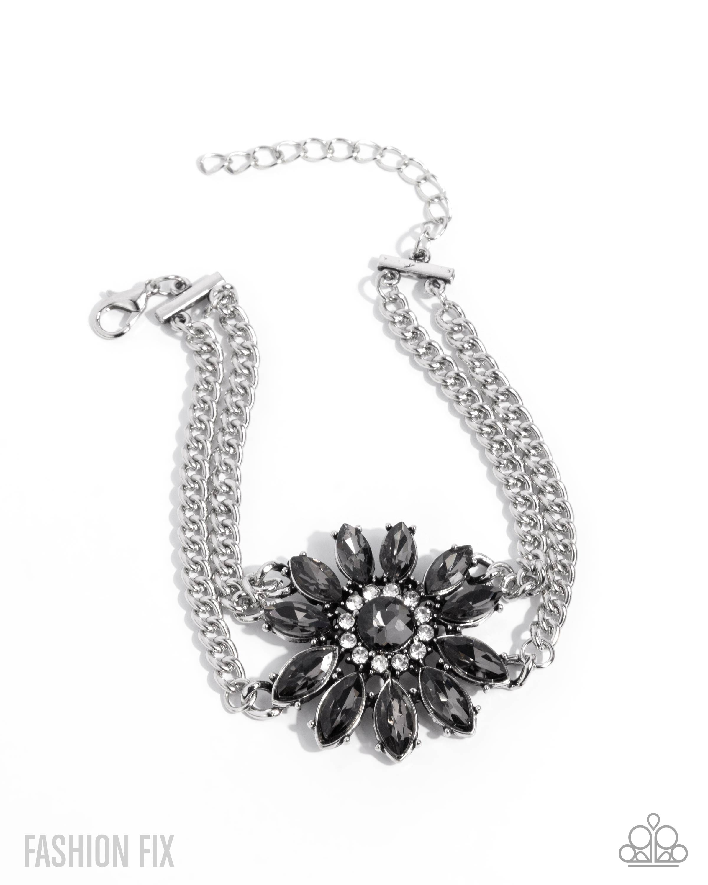 A dazzling explosion of smoky marquise-cut gems in varying sizes bursts into a bold floral centerpiece, blooming from a twinkling white rhinestone and round smoky gem centerpiece for a touch of extra glam. Stacked silver curb chains wrap around the wrist, creating a dramatic yet sophisticated finish. Features an adjustable clasp closure.