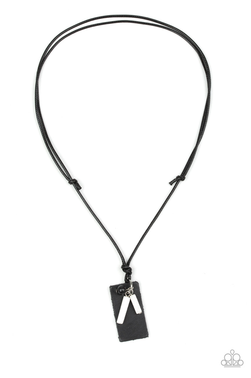 A piece of black leather, dainty black bead, and white stone pendants are knotted at the bottom of a shiny black cord for an urban look. Features an adjustable sliding knot closure.