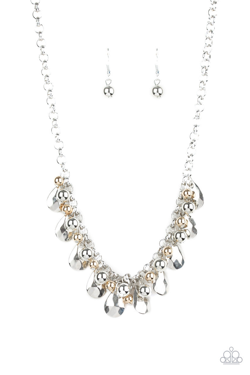 A collection of shiny silver and glistening gold beads join faceted silver teardrops along the bottom of a bold silver chain, creating an edgy fringe below the collar. Features an adjustable clasp closure.