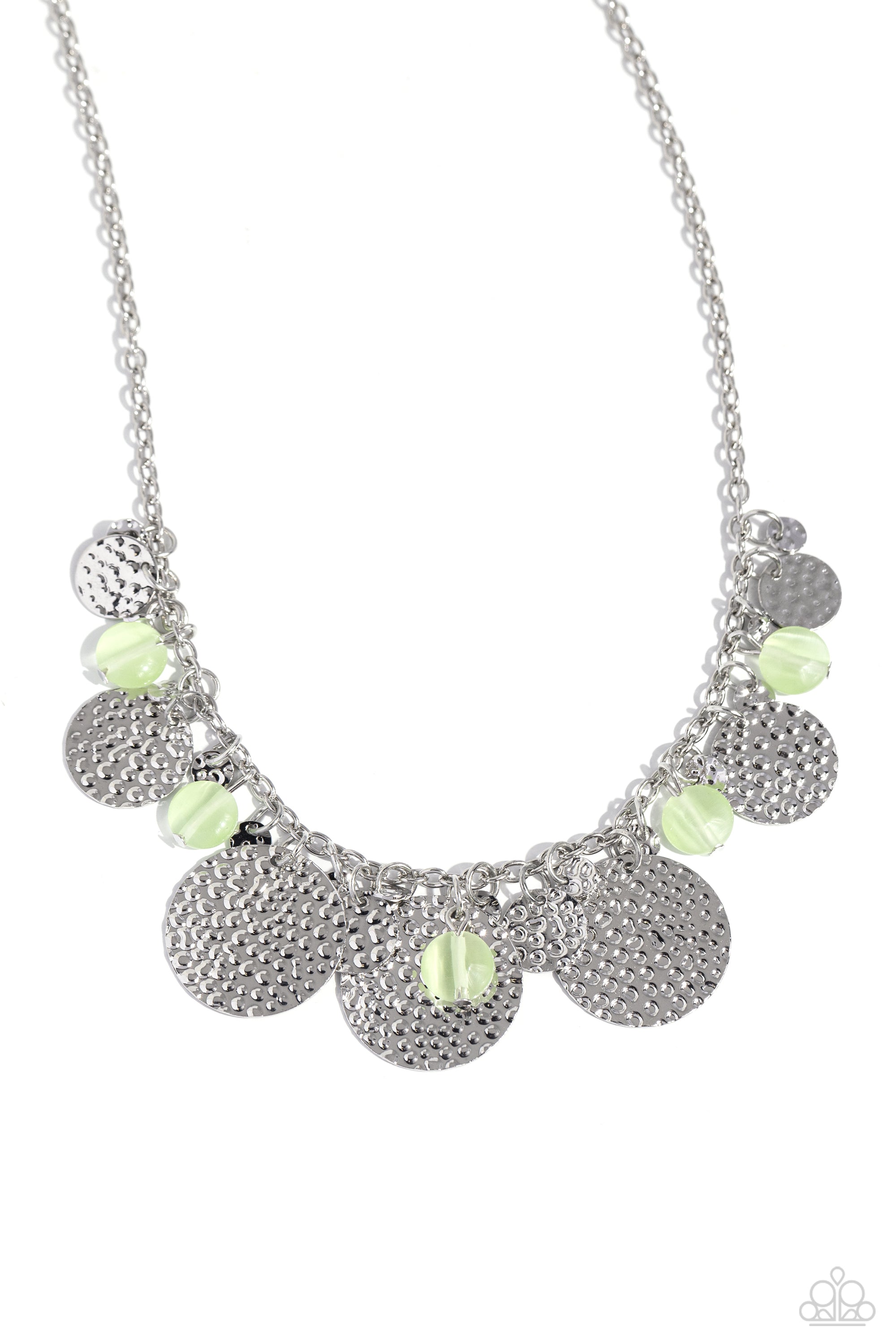Radiant Review - Green - Cat's Eye Bead Silver Hammered Disc Paparazzi Short Necklace