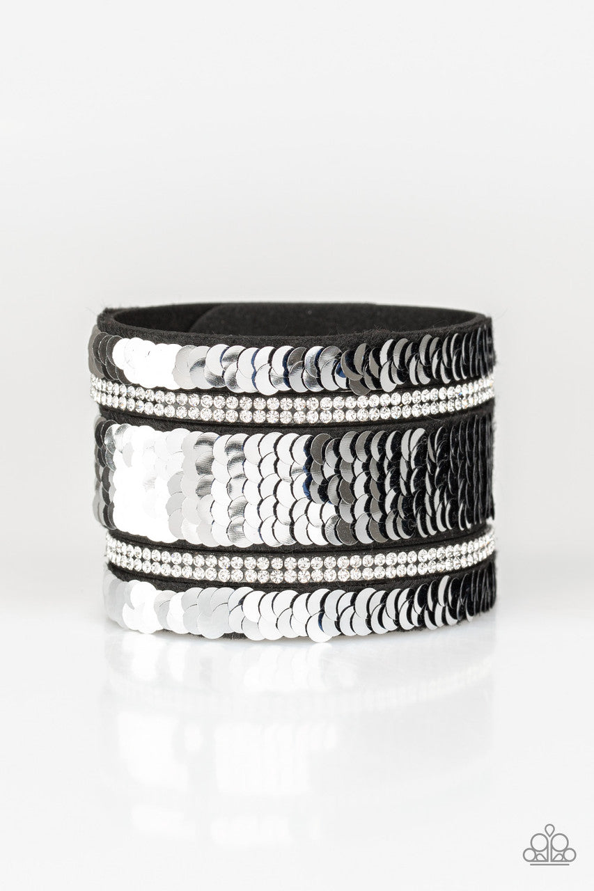 Infused with strands of blinding white rhinestones, row after row of shimmery sequins are stitched across the front of a spliced black suede band. Bracelet features reversible sequins that change from silver to blue. Features an adjustable snap closure.