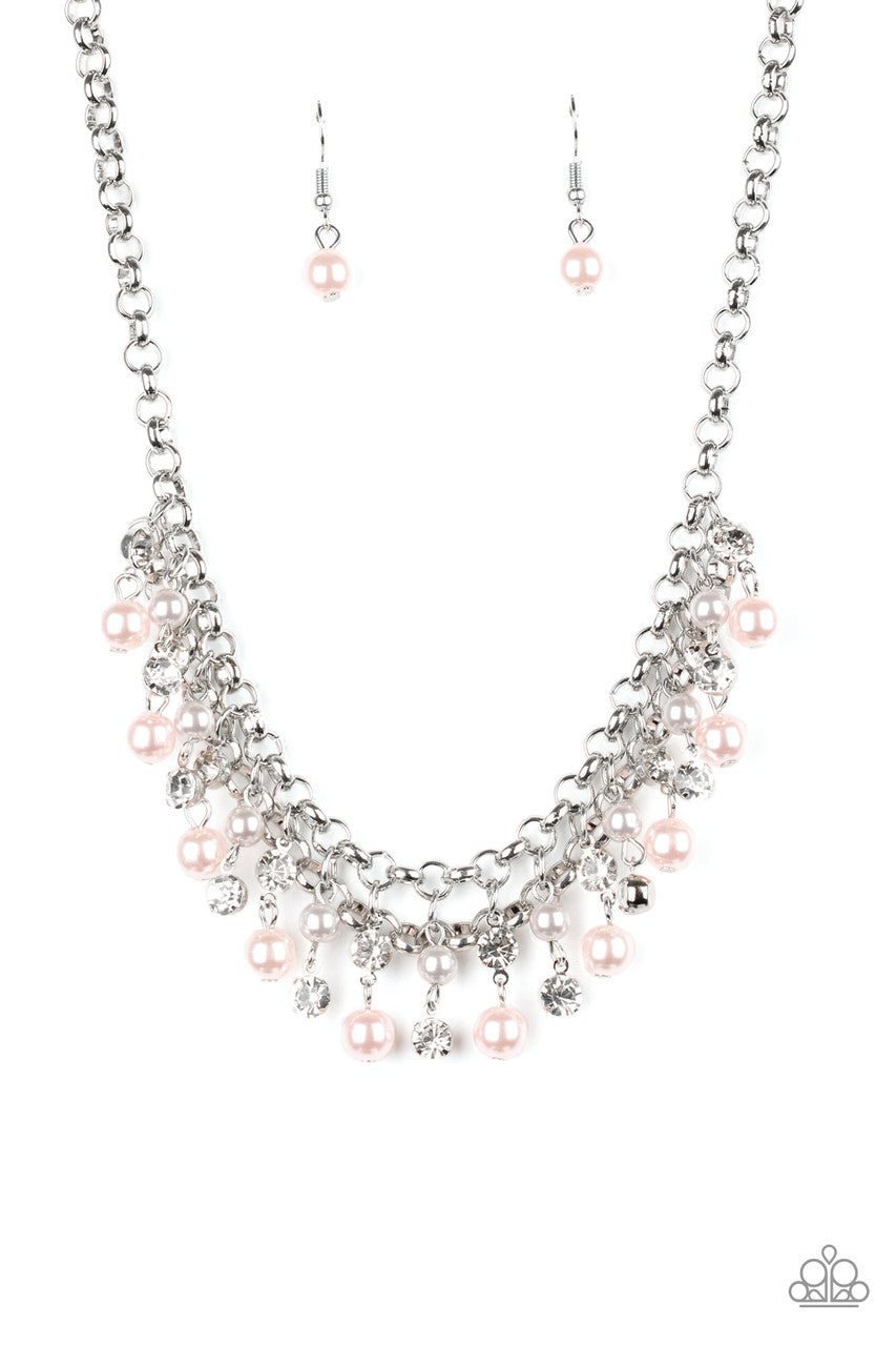 Glittery white rhinestones and classic pink and silver pearls swing from the bottom of interlocking silver chains, creating a bubbly fringe below the collar. Features an adjustable clasp closure.