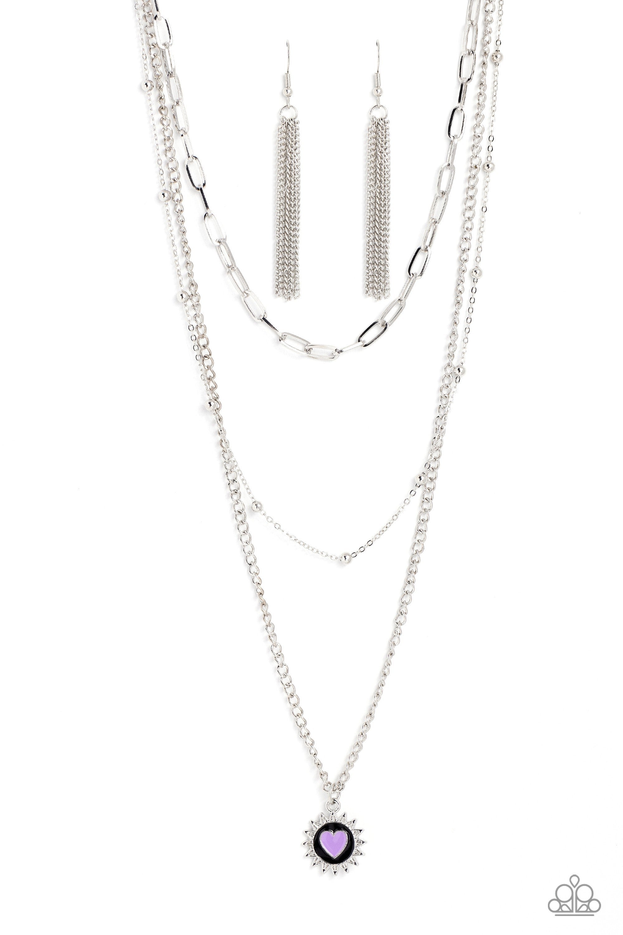 Three silver chains cascade in various lengths across the chest, creating a radiantly edgy display. The centermost chain is dotted with silver studs while a sunburst silver frame, embellished with a black center and a purple painted heart, creates a youthful pendant at the bottom of the longest chain in a colorful finish. Features an adjustable clasp closure.