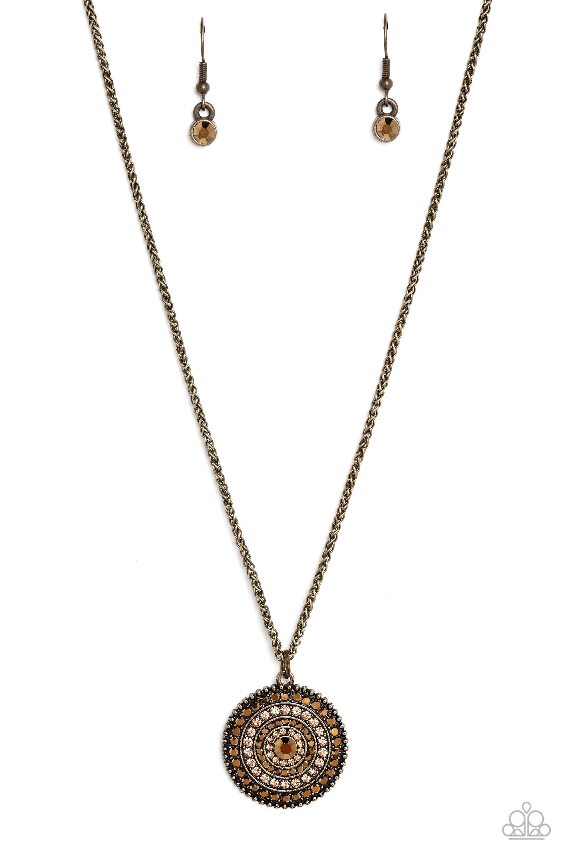 Featured on a scalloped brass pendant, rows of aurum and light colored topaz encircle an aurum rhinestone center, creating an eclectic mandala-like design. Features an adjustable clasp closure.