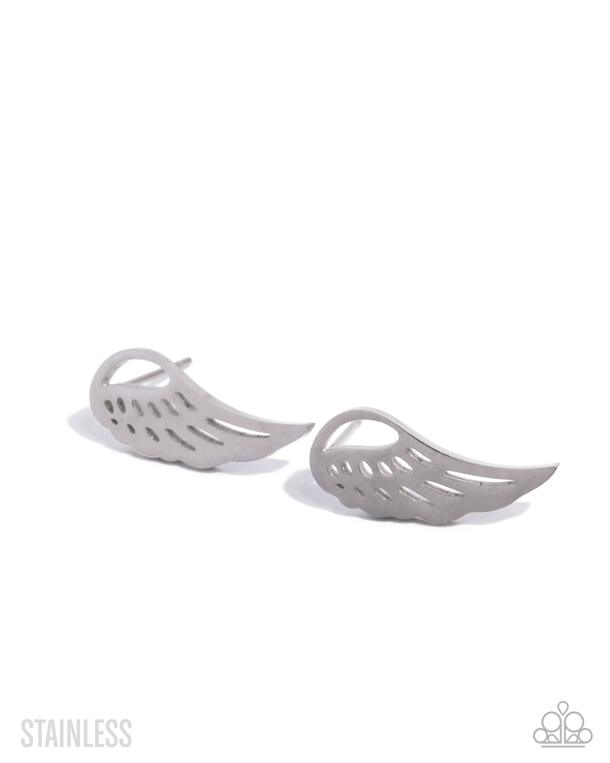 Featuring stainless steel, a textured silver angel wing sits atop the ear for a sensational display. Earring attaches to a standard post fitting.