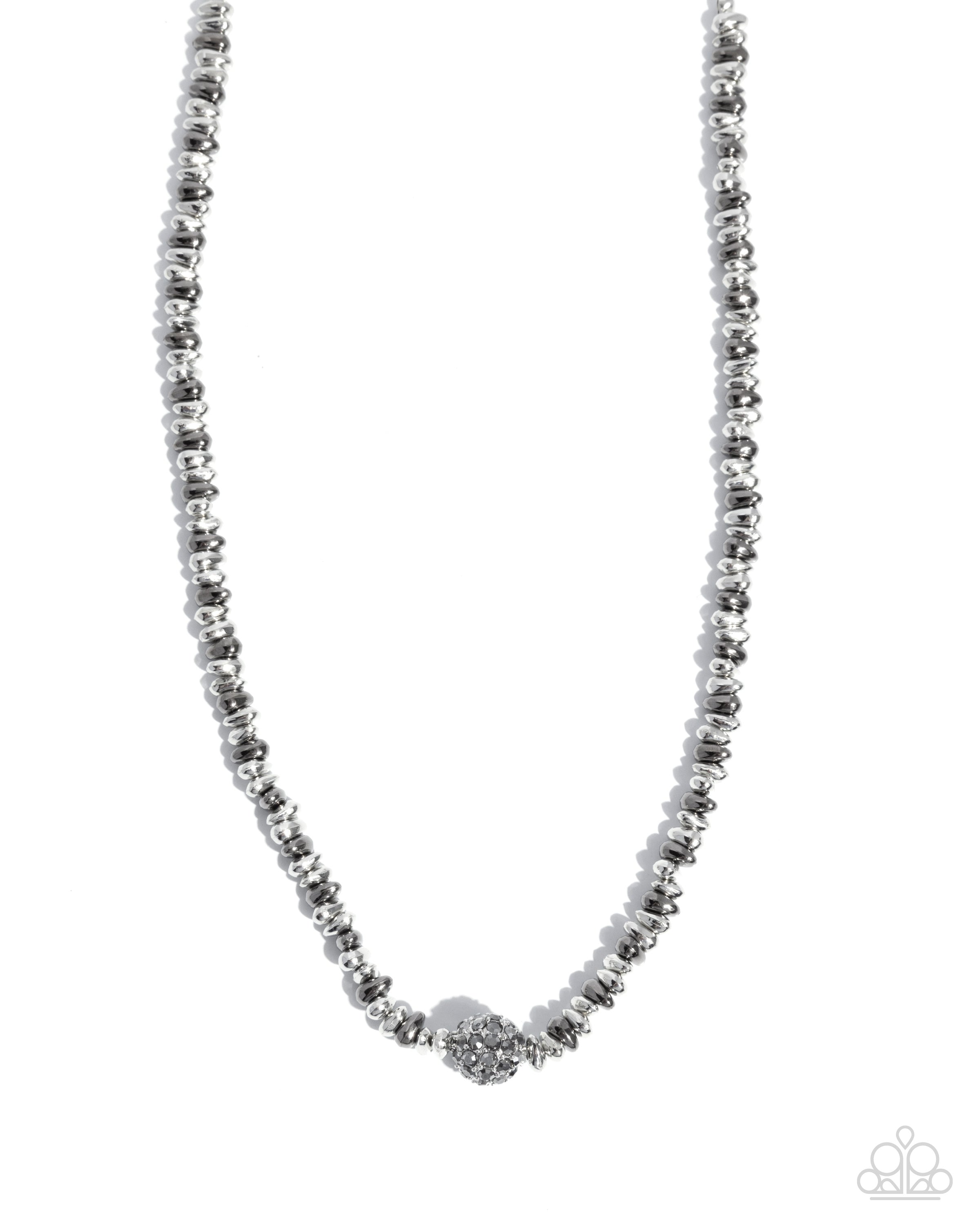 Infused along an invisible string, a collection of chiseled silver and gunmetal pebbles alternate below the neckline leading the eye to its center silver ornament dusted in hematite and smoky rhinestones for a brilliantly bold display. Features an adjustable clasp closure.
