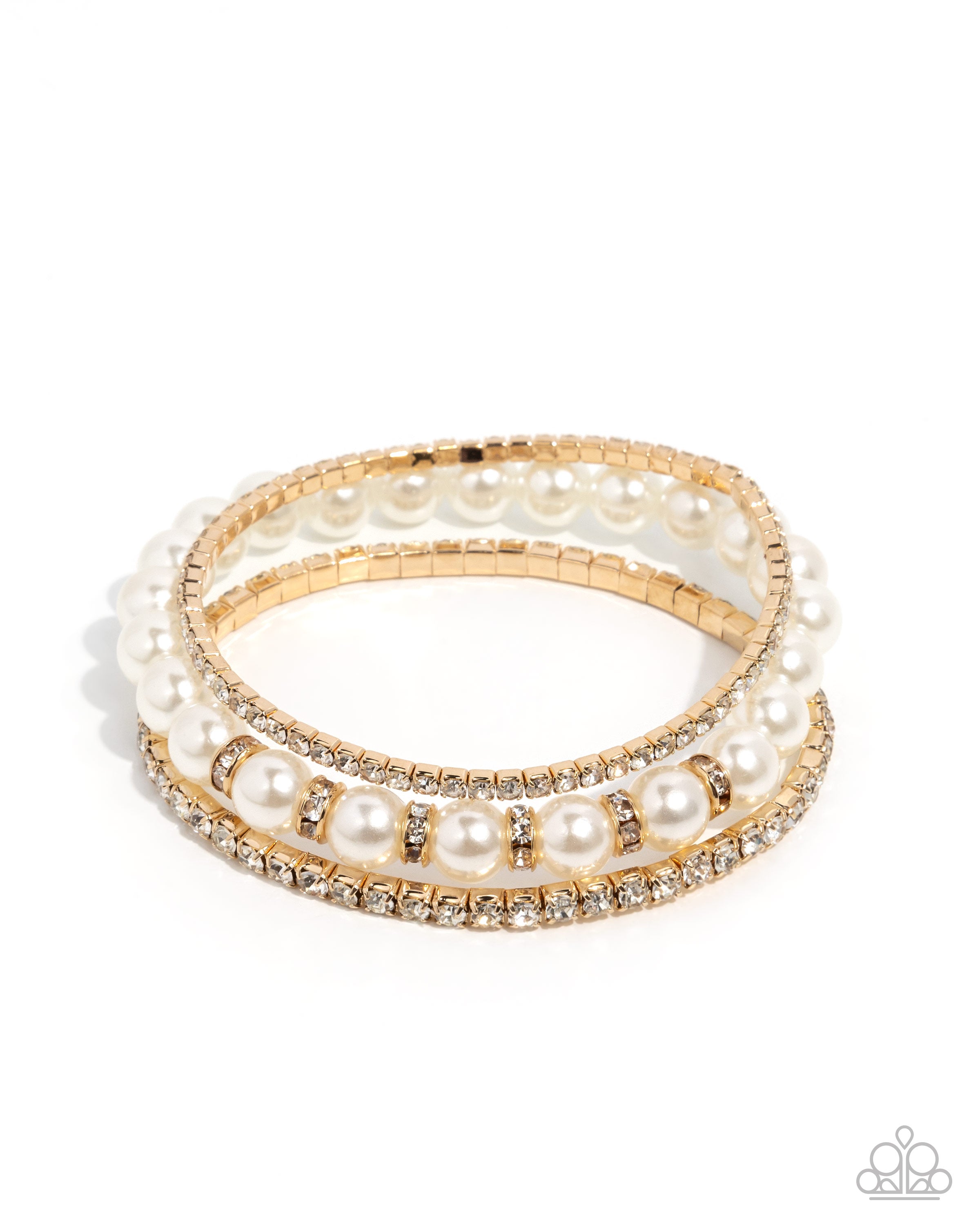 Pressed in gold square fittings, a collection of glistening white rhinestones in varying sizes joins a strand of lustrous white pearls that alternate with white rhinestone-embellished gold rings along elastic stretchy bands for a twinkling, treasured stack atop the wrist.