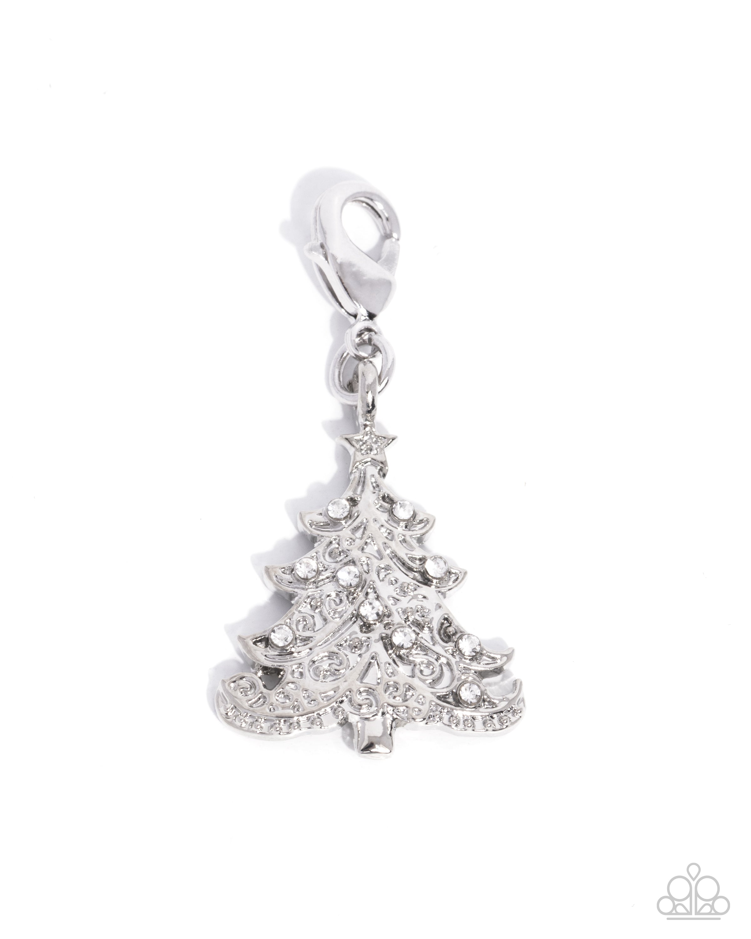 Featuring a high-sheen Rhodium dip, a white rhinestone-embellished, layered silver Christmas Tree reflects light in every direction. Features a clasp closure. Can be attached to a variety of chains for a Winter-inspired design. Charm measures approximately 3/4" in length.