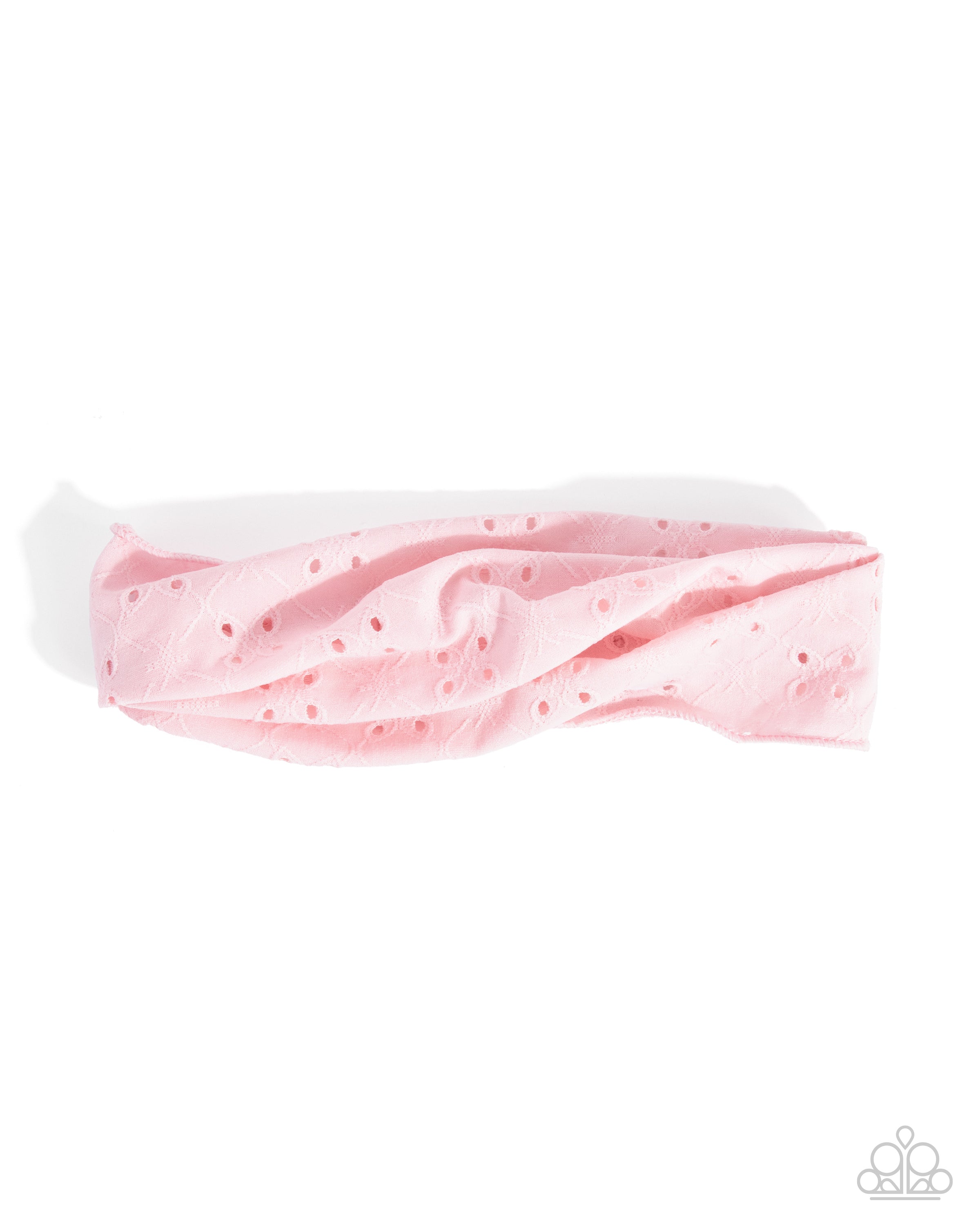 Featuring an eyelet motif, a thick, pink floral ribbon curls atop the head, creating an adorably adjustable look.