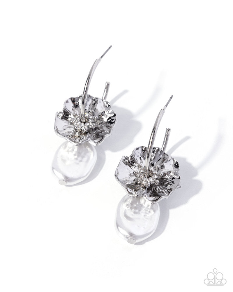 Featuring a studded-stamen airy center, a hammered, crimped silver flower is infused along a glistening silver hoop, giving way to a baroque, elongated oval pearl for a feminine, polished display. Earring attaches to a standard post fitting. Hoop measures approximately 1" in diameter.