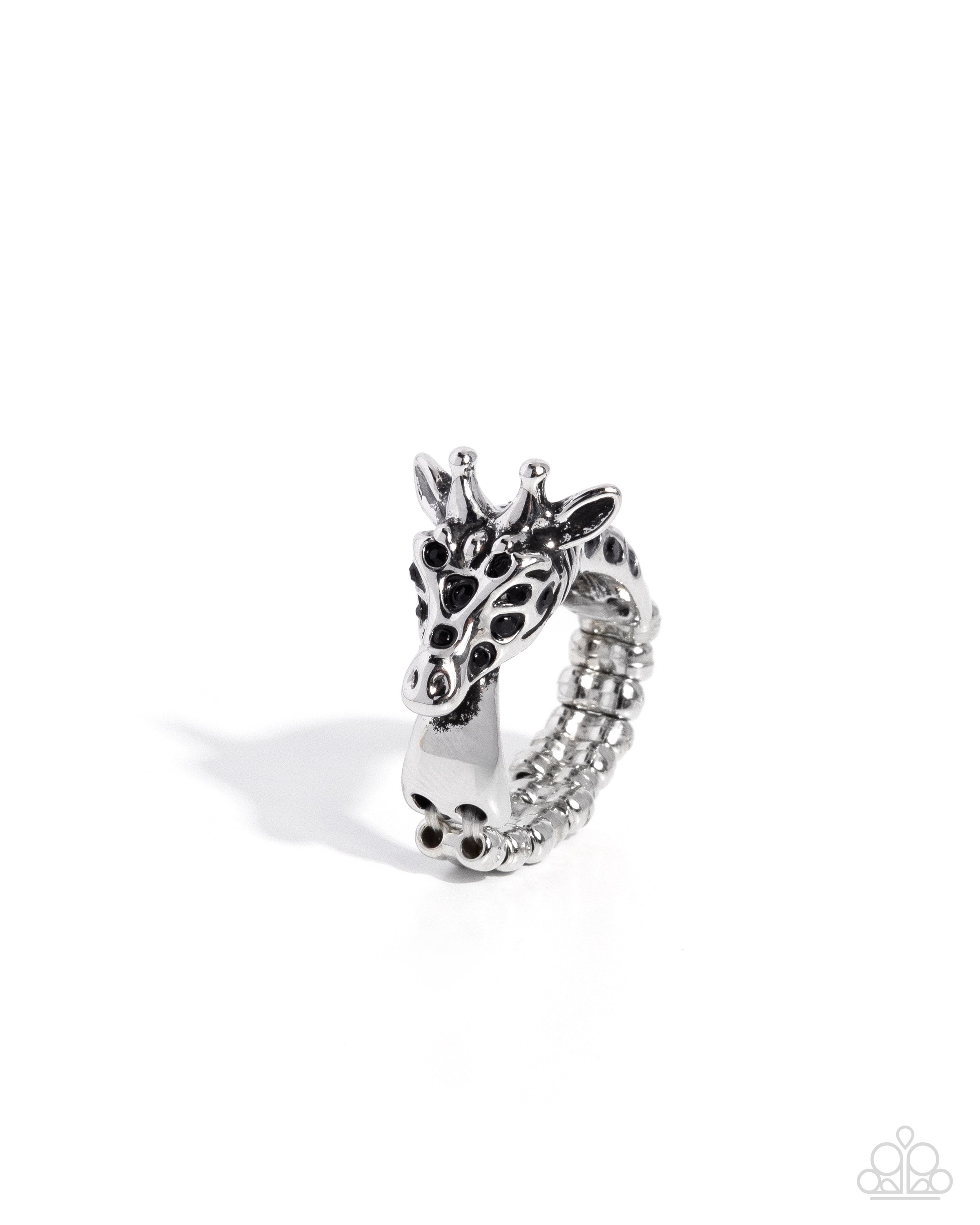 Featuring black spots, a silver giraffe, complete with black rhinestone eyes, curls around the finger for a wildly whimsical display. Features a dainty stretchy band for a flexible fit.