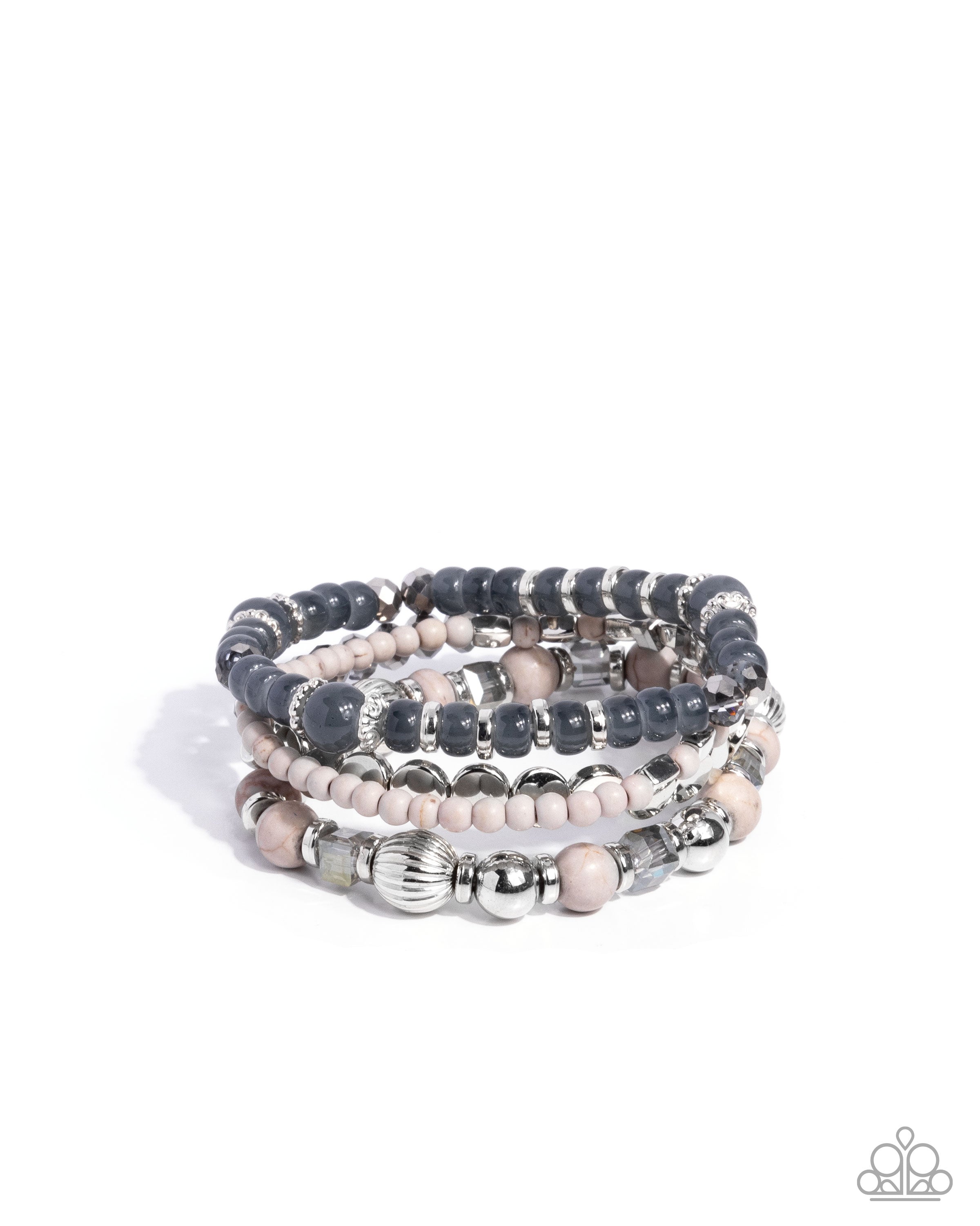 Infused along elastic stretchy bands, a collection of varying silver beads in sleek, floral, and smooth textures pattern beside light gray milky beads, faceted UV shimmery gray cubed beads, and white stone beads in varying sizes for a mesmerizing stack atop the wrist.
