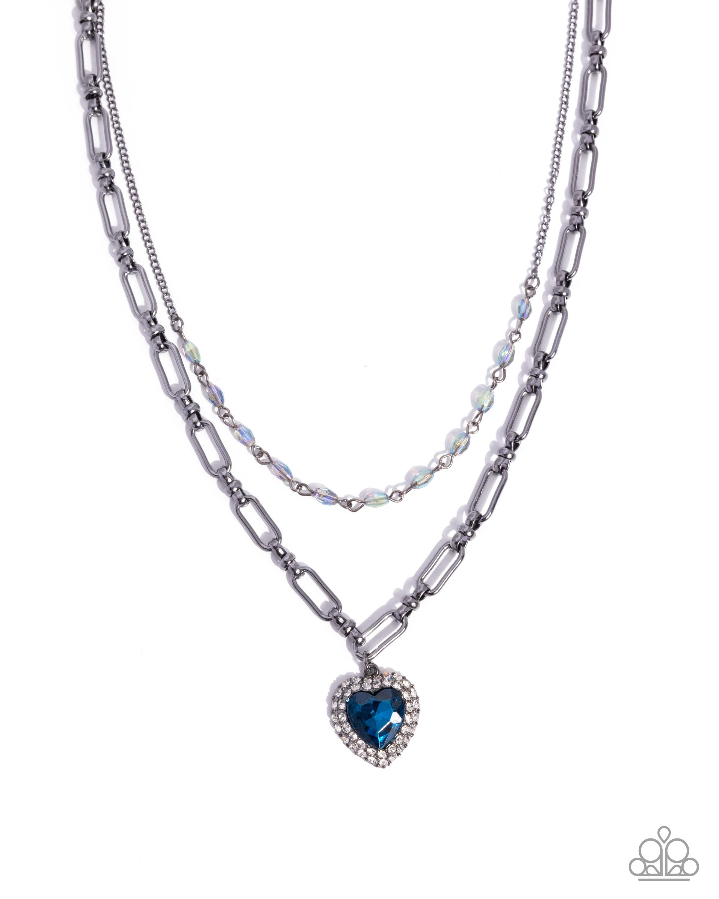 Infused with UV-shimmery oval beads, mismatched classic and elongated anchor gunmetal chains layer below the neckline for an eye-catching display. Pressed in a white rhinestone-layered gunmetal heart pendant, a blue heart gem sways from the lowermost chain for a radiantly romantic finish. Features an adjustable clasp closure.