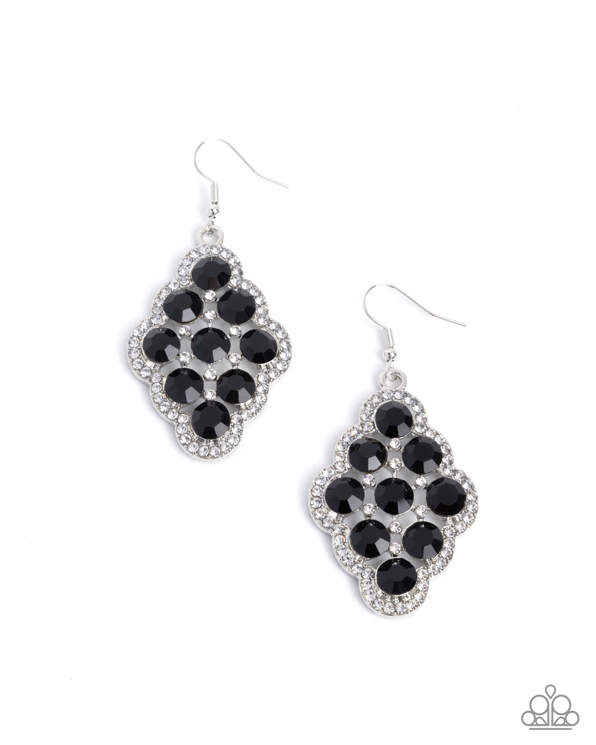 Dusted in white rhinestones, a silver scalloped border encapsulates additional dainty white rhinestones and a collection of faceted black gems for an airy avant-garde display. Earring attaches to a standard fishhook fitting.