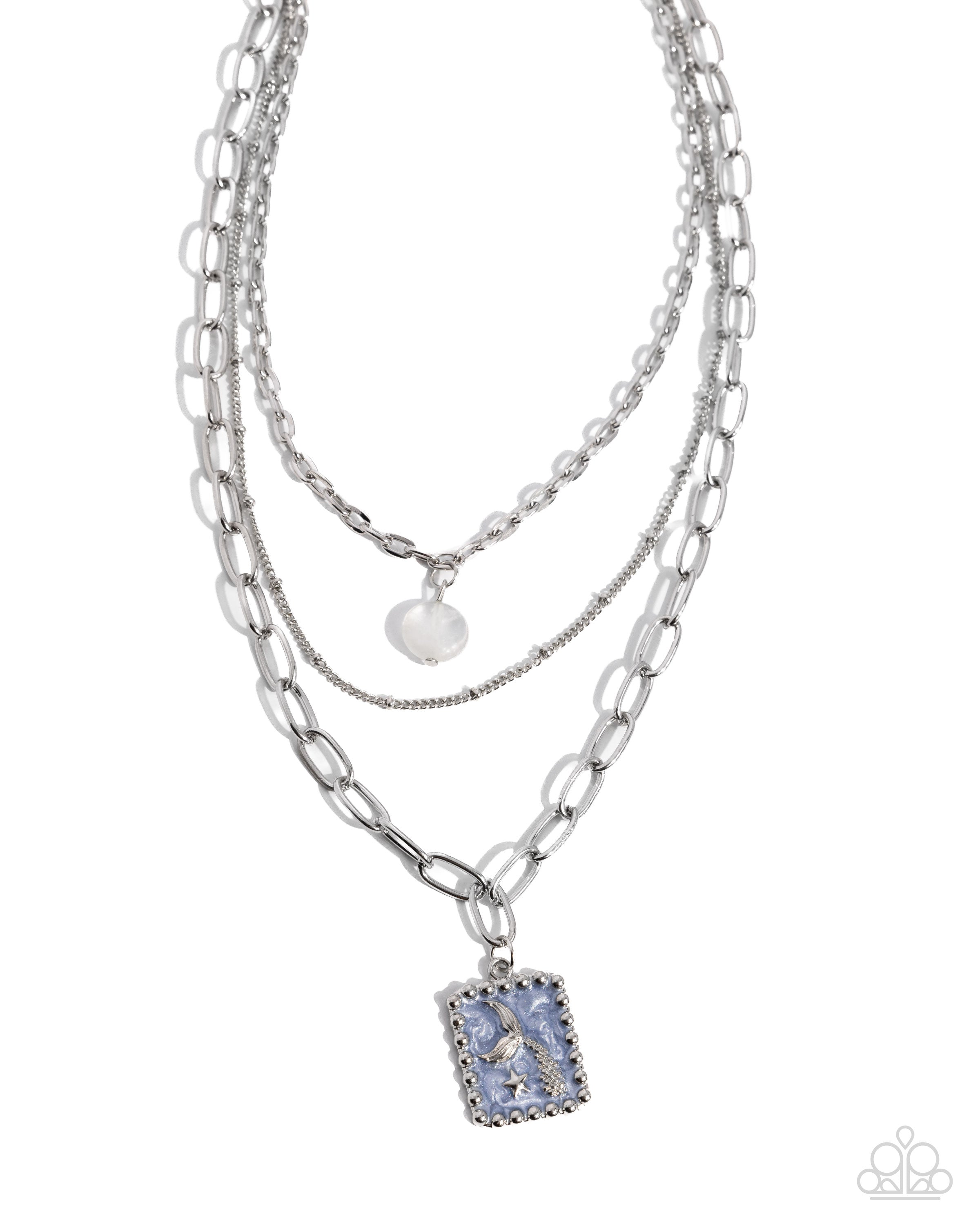 Three shimmery silver chains cascade below the chest, creating graceful layers. A round, clear white stone bead hangs from the uppermost chain while a raised, textured silver mermaid tail and solitaire silver star are featured in the center of a pearly Chambray Blue-painted, silver-studded pendant for a coastally chic look. Features an adjustable clasp closure. As the stone elements in this piece are natural, some color variation is normal.