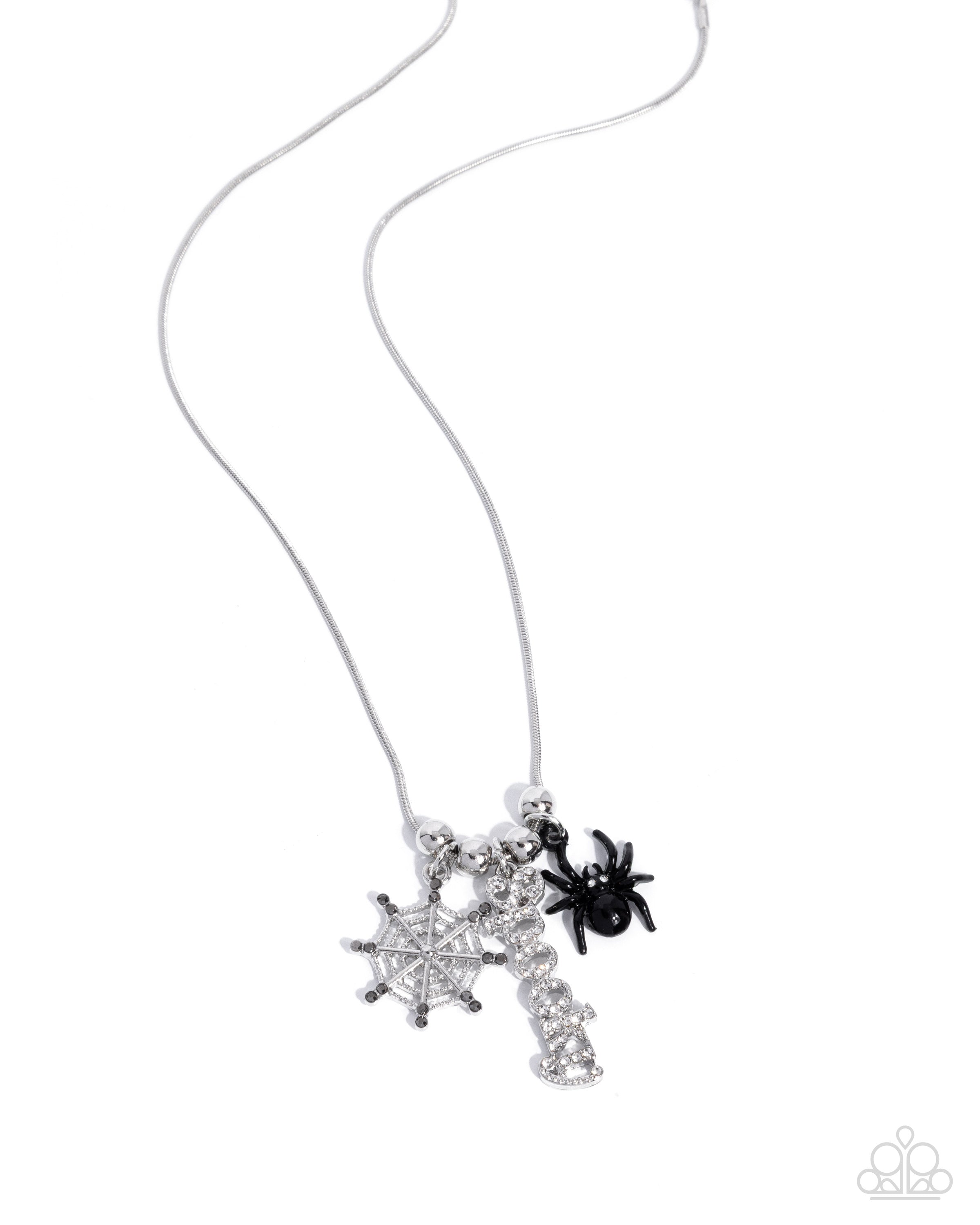 Infused along a silver snake chain, a collection of Halloween-inspired charms including the word "spooky" in white rhinestones, a black-painted spider with white rhinestone details, and a textured silver spiderweb with stacks of hematite rhinestones at its ends alternate with glistening silver beads below the neckline for a haunted haute look. Features an adjustable clasp closure.