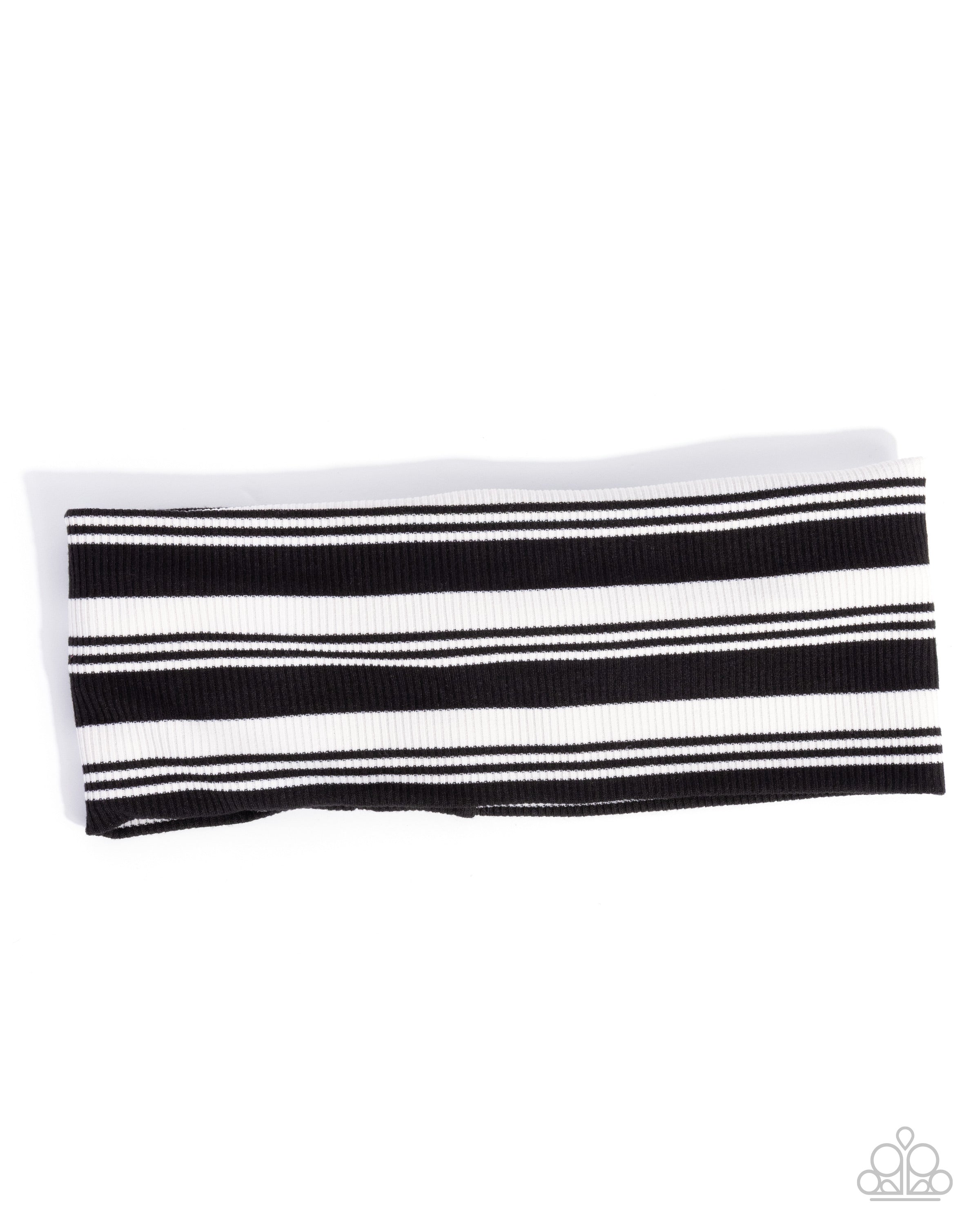 Featuring white stripes in varying widths, a soft black fabric band wraps atop the head, evoking a modern, laidback vibe.