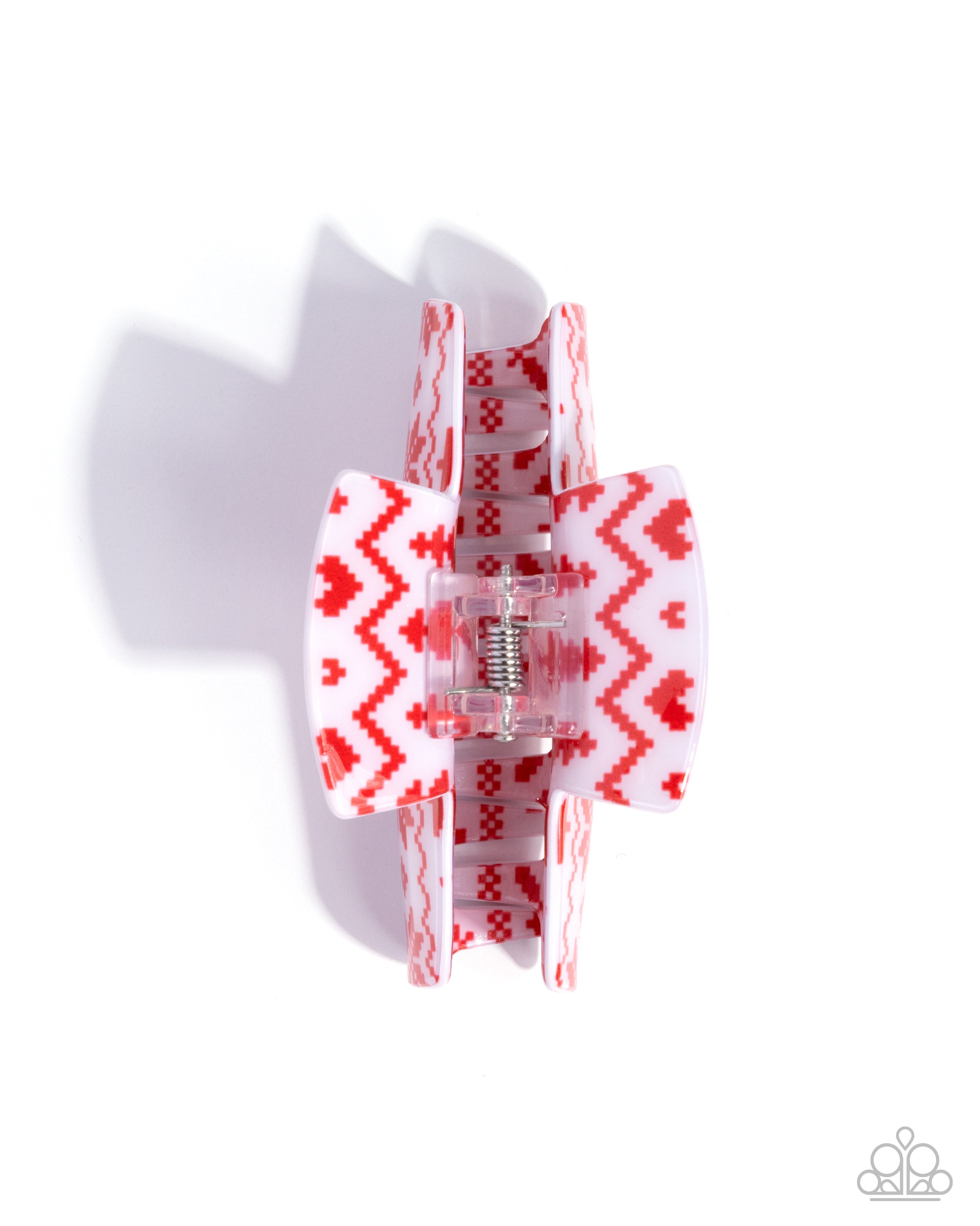 Modeled after a sweater, a white claw clip, complete with red-painted details including trees, snowflakes, hearts, and Christmas-inspired squiggles, holds the hair away from the face for an on-the-go, winter-chic display. Clip measures approximately 1 3/4" in length and 3 1/2" in width.