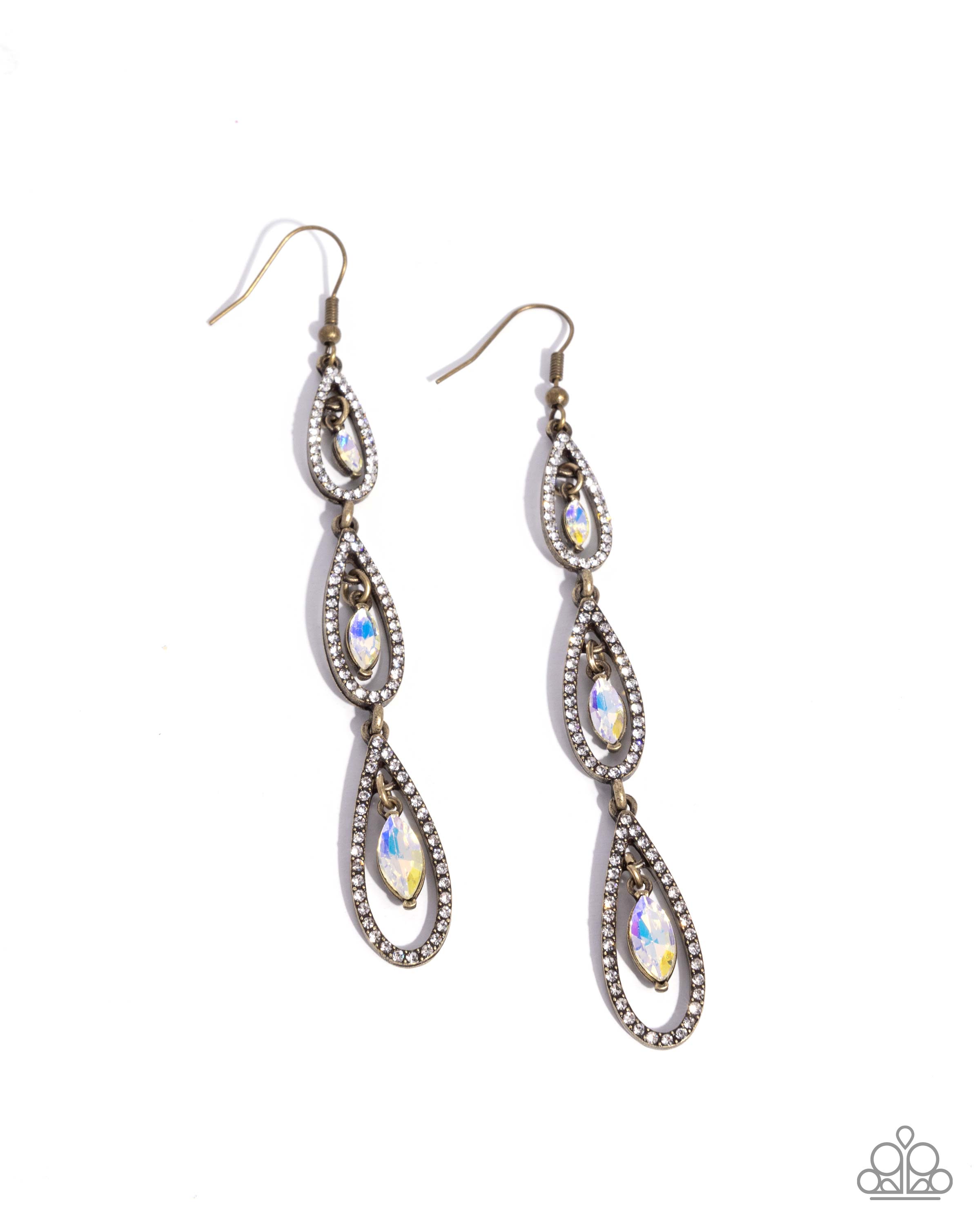 Antique-inspired brass teardrops cascade in a tiered design, each bordered with dainty white rhinestones. Encased within each frame, faceted iridescent gems shimmer with a prismatic brilliance, adding a glamorous touch to the vintage silhouette. Earring attaches to a standard fishhook fitting.