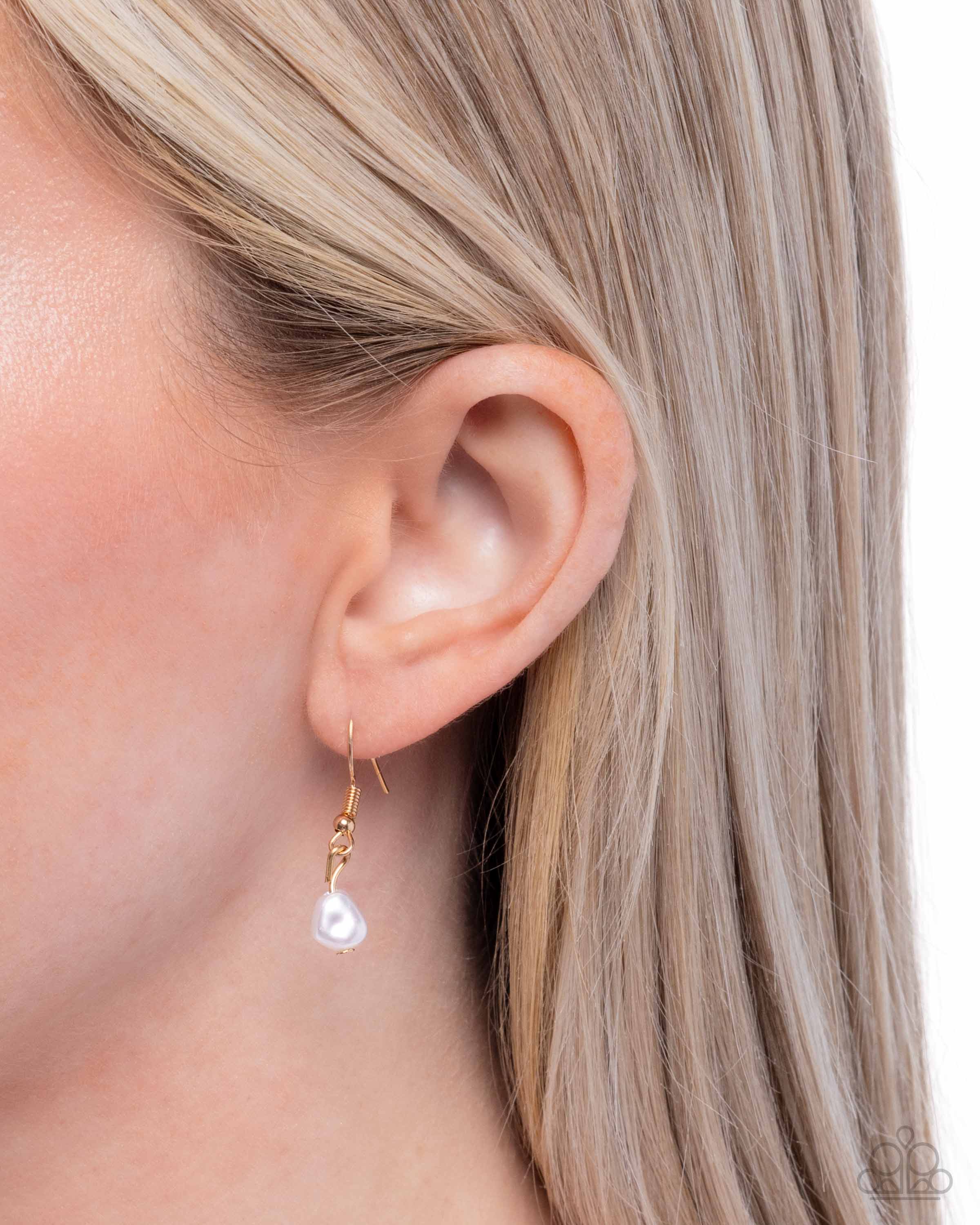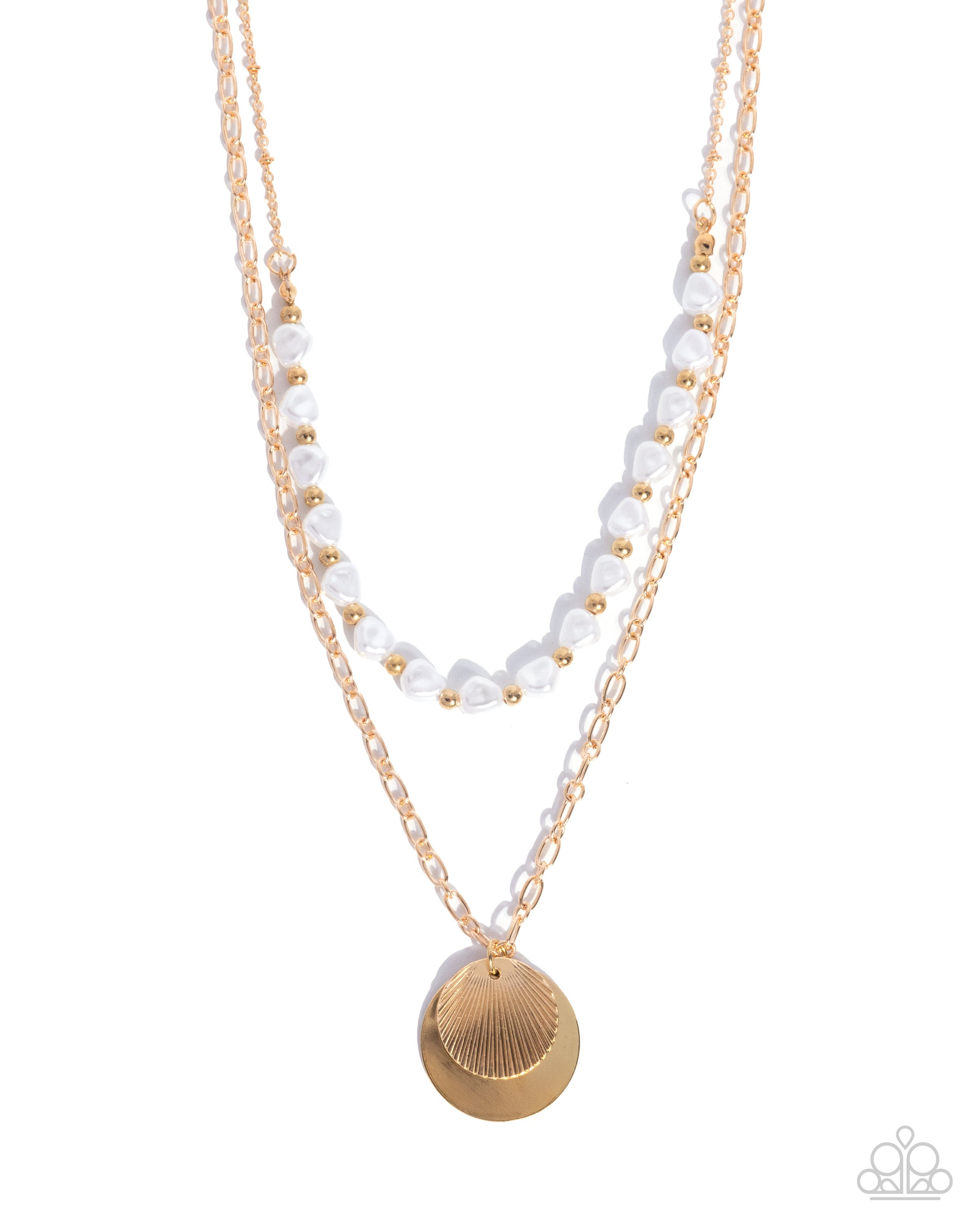 Two strands of gold chains, accented with a row of lustrous white pearls, rests below the collar. The bottom strand is adorned with a polished gold shell-shaped disc, and a smooth gold disc, creating a radiant and beach-inspired look. Features an adjustable clasp closure.