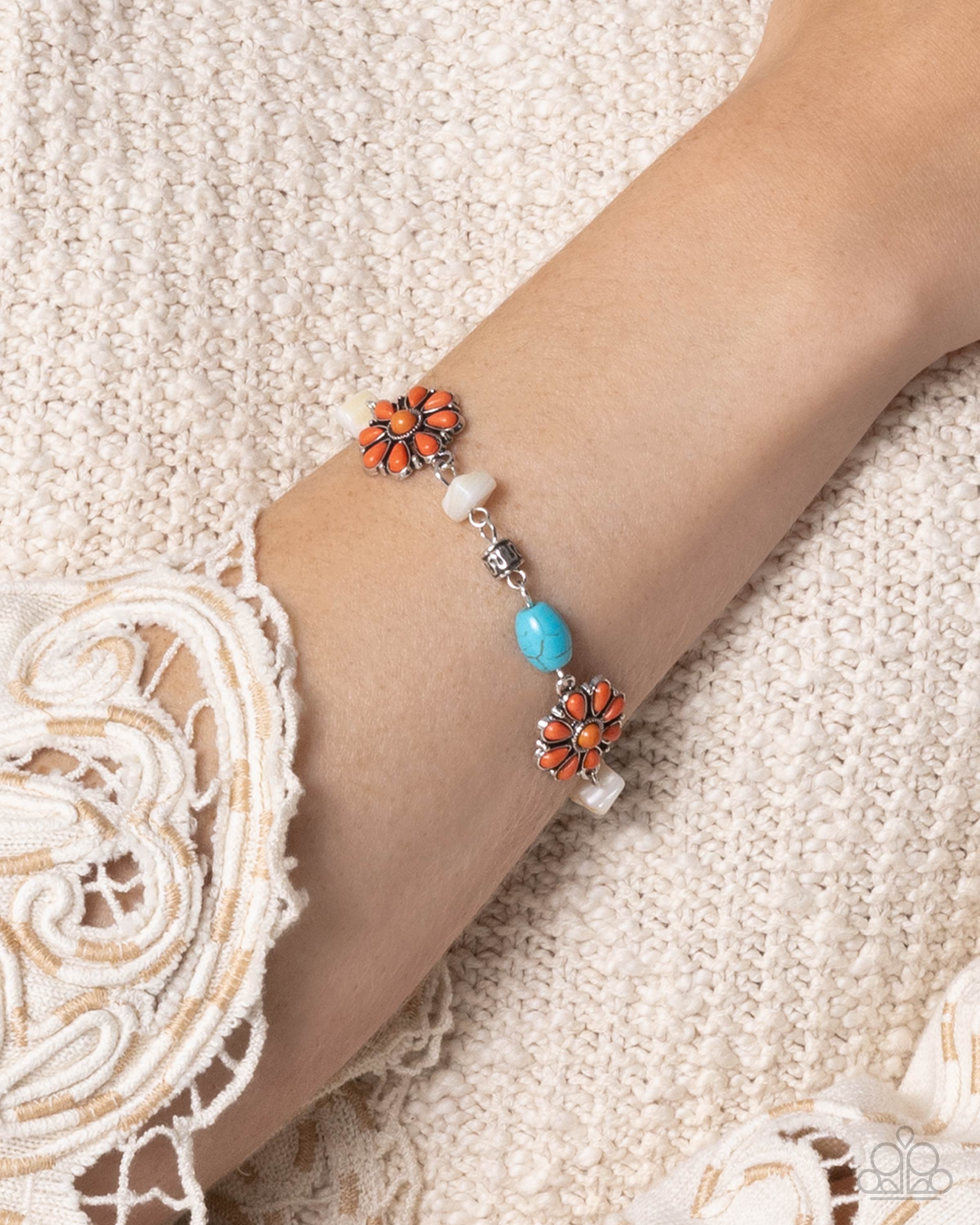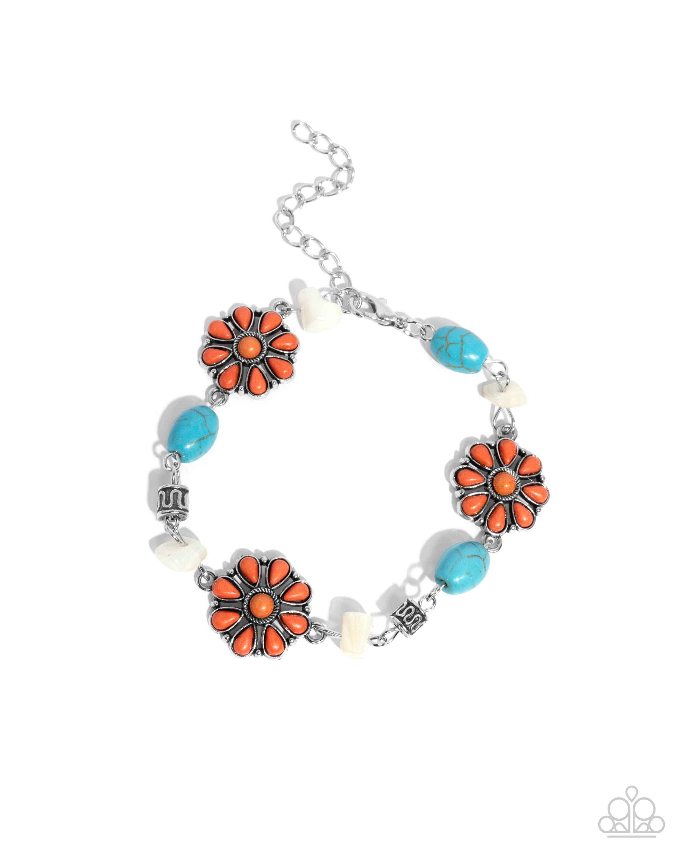 A collection of orange stone teardrop petals bloom out along the neckline for a whimsical floral display. Additional turquoise stone beads, chiseled white acrylics, textured silver discs, and Buckthorn Brown acrylics are also infused along the neckline for additional earthy detail and texture. Features an adjustable clasp closure. As the stone elements in this piece are natural, some color variation is normal.