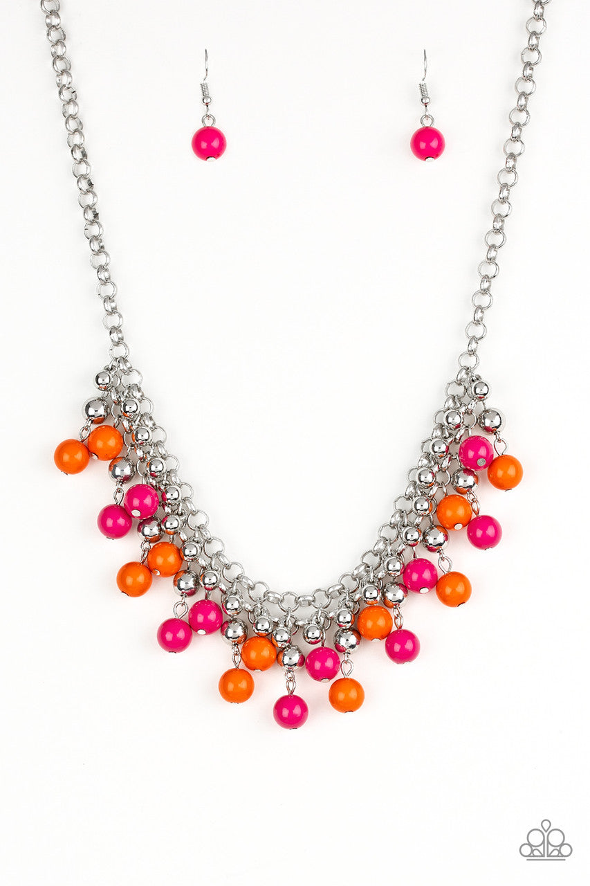 Rows of classic orange, pink, and silver beads trickle from two rows of interlocking silver chains, creating a bold colorful fringe below the collar. Features and adjustable clasp closure.