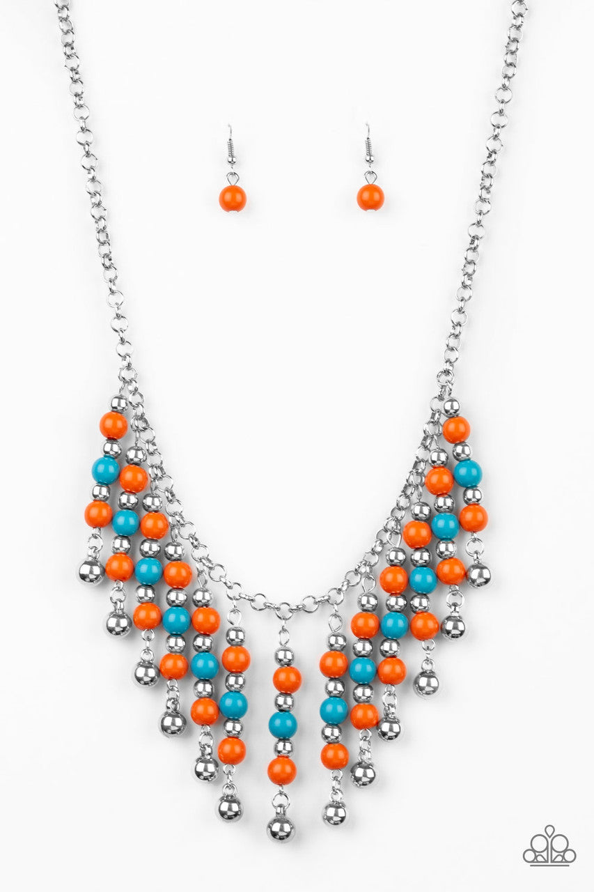 A collection of orange, blue, and silver beads are threaded along metallic rods as they swing from the bottom of a shimmery silver chain, creating a flirtatious fringe below the collar. Features an adjustable clasp closure.