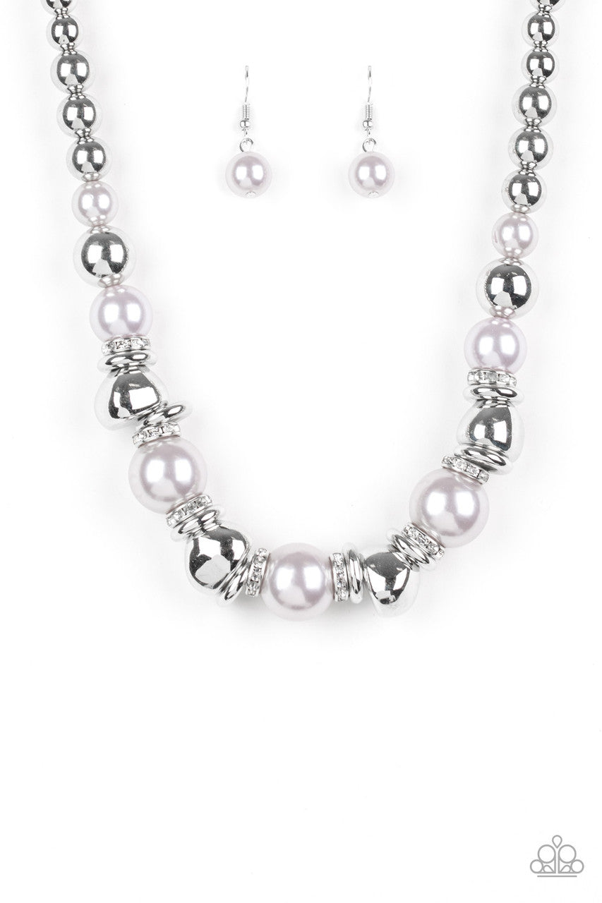 A collection of oversized gray pearls, silver rings, and asymmetrical silver beads are threaded along an invisible wire below the collar. White rhinestone encrusted rings are sprinkled between the refined beading for a statement-making finish. Features an adjustable clasp closure.