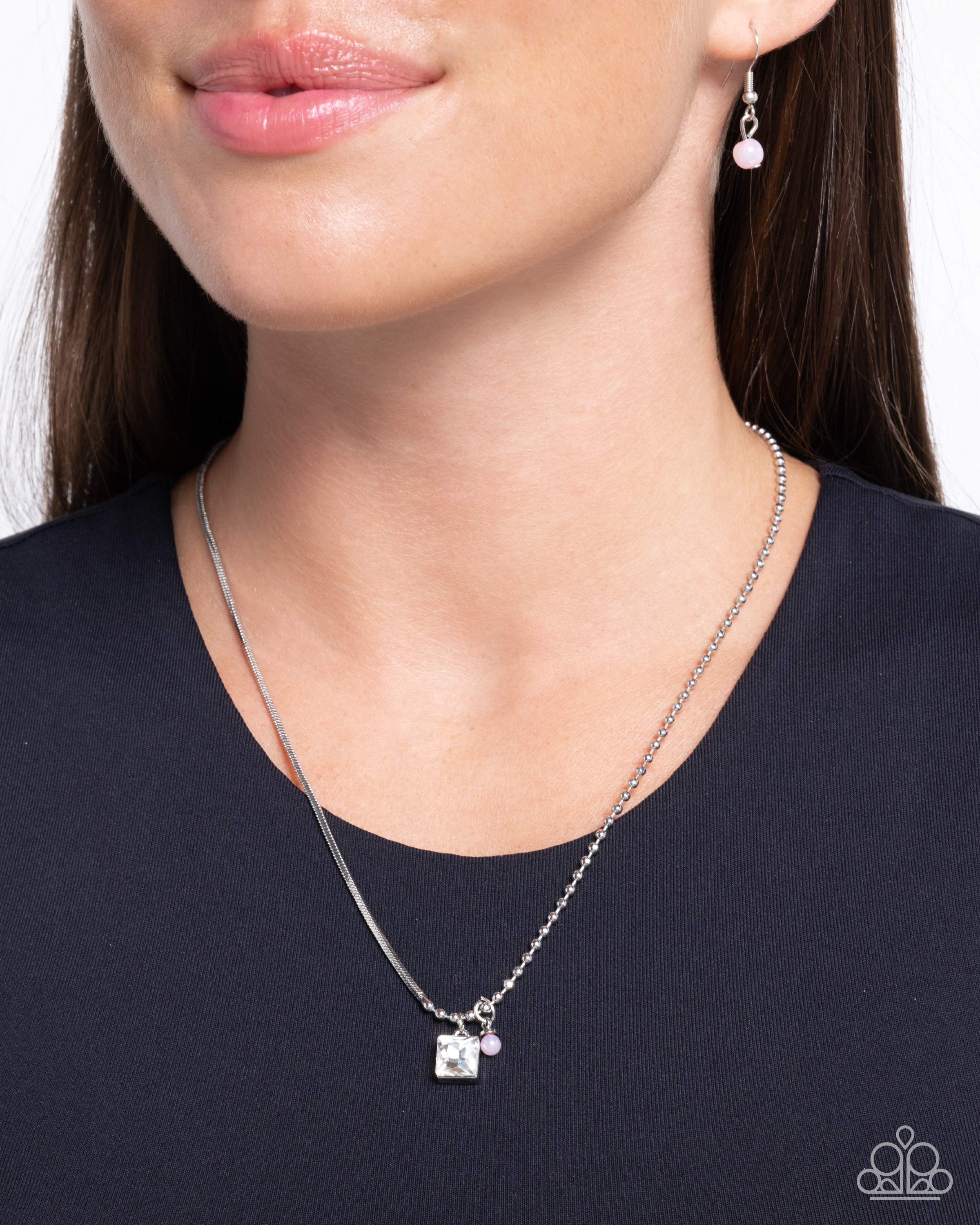 A dainty silver chain collides with a dainty silver ball chain to create an abstract monochromatic blend below the neckline. A solitaire faceted white square-cut gem and iridescent-brushed baby pink pearl glide along the textured chains, perfectly balancing the contrasting design with eye-catching color and shimmer. Features an adjustable clasp closure. Due to its prismatic palette, color may vary.