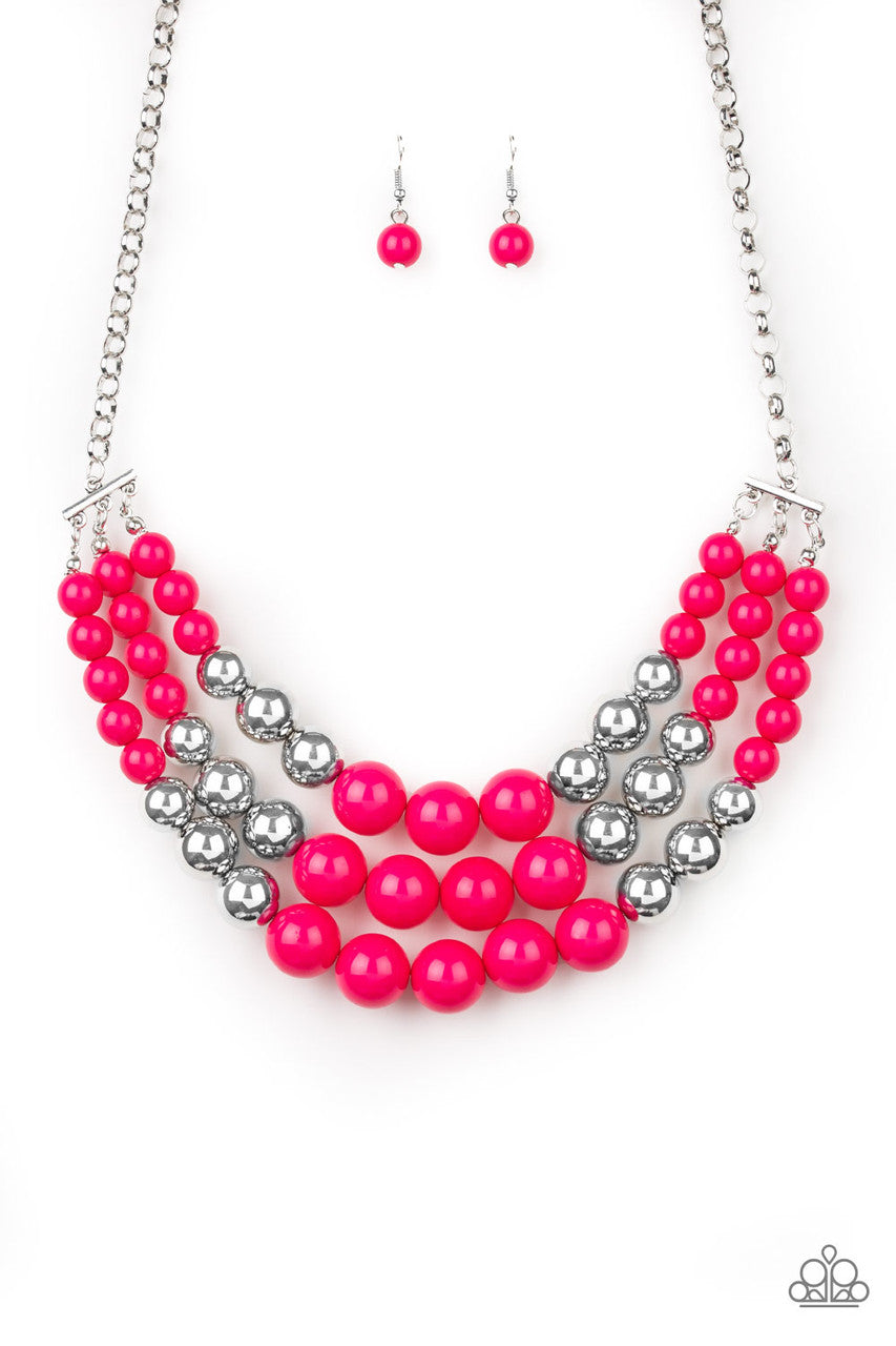 Gradually increasing in size near the center, a collection of pink and silver beads layer below the collar in a statement making fashion. Features an adjustable clasp closure.