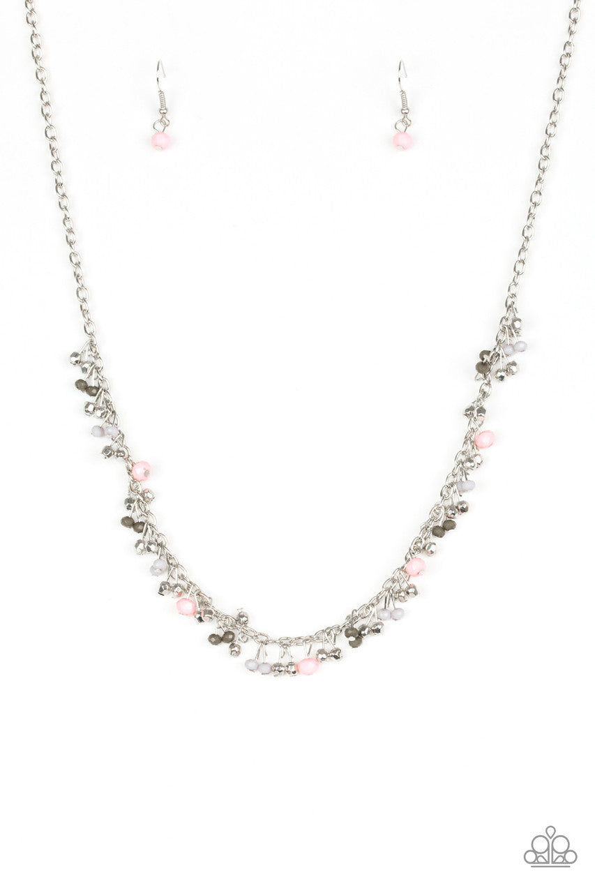 A variety of faceted pink, light gray, and dark gray beads swing from a shimmery silver chain, creating a flirtatious fringe below the collar. Faceted silver beads trickle between the colorful beads, adding a hint of shimmer to the seasonal design. Features an adjustable clasp closure.