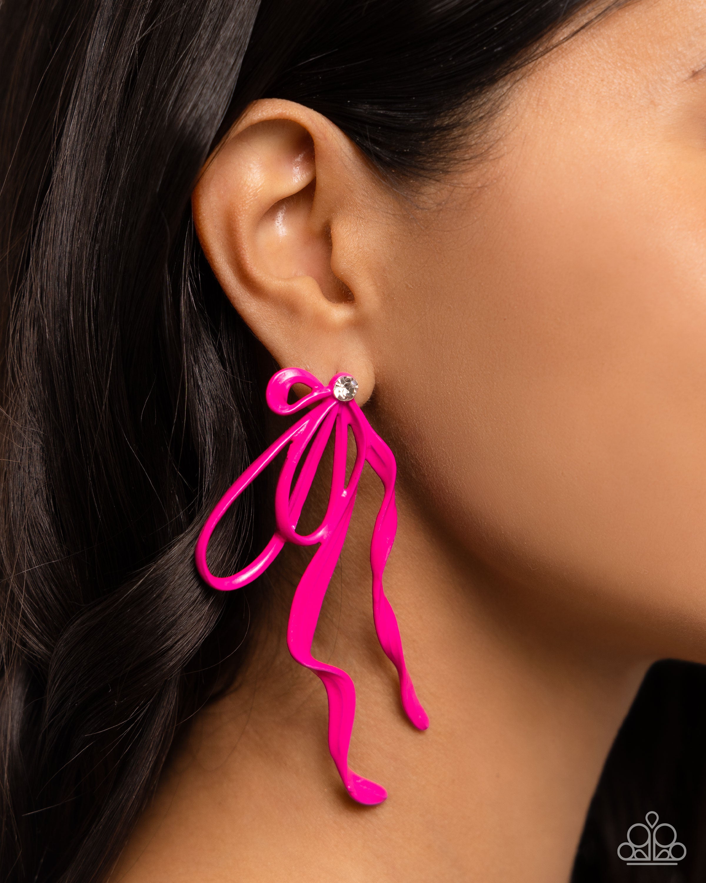 Dipped in a Pink Peacock hue, a curly and loopy bow featuring a solitaire white gem glistens from the ear for a colorfully classy look. Earring attaches to a standard post fitting.