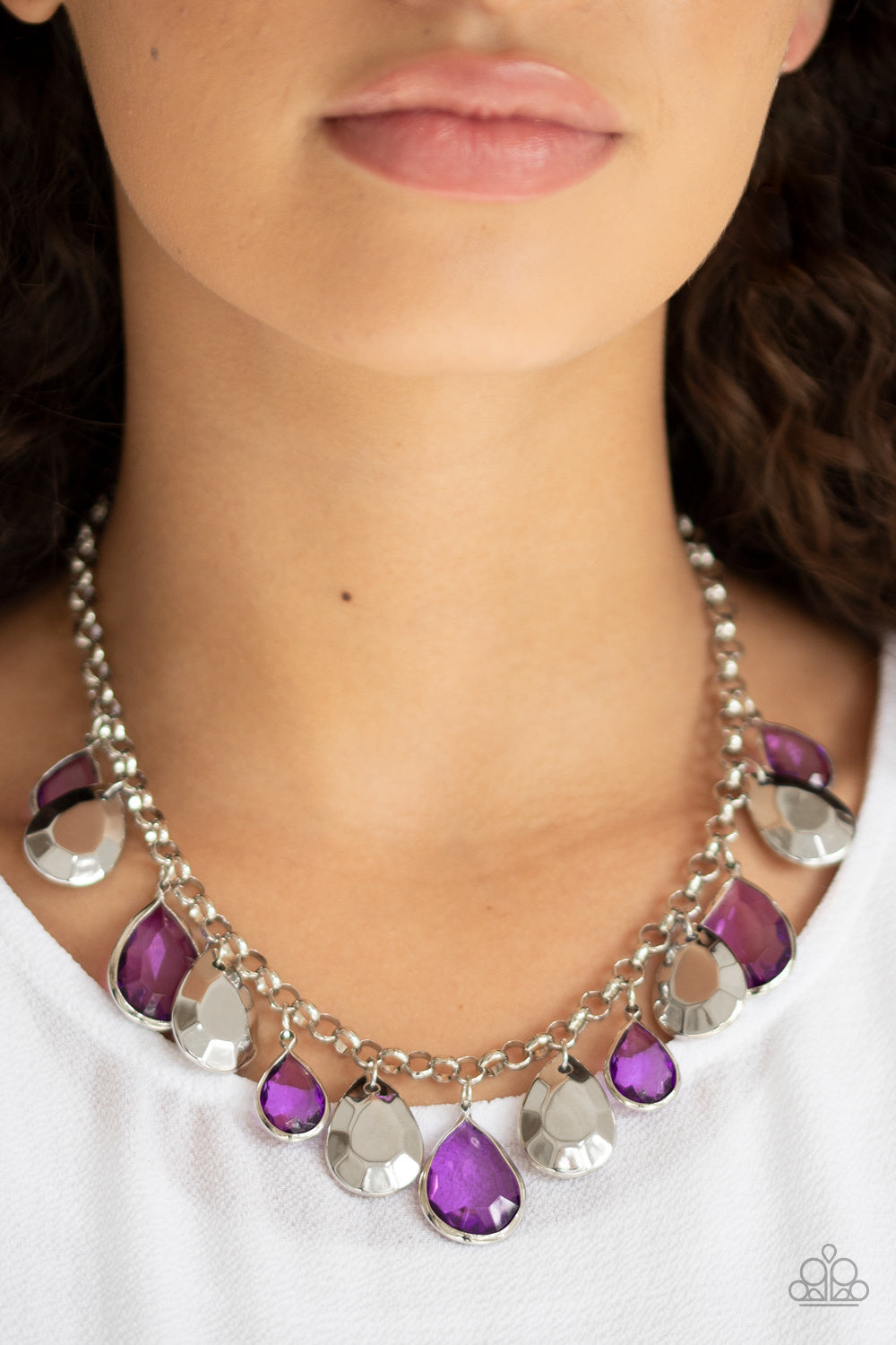 A collection of glassy purple and faceted silver teardrops drip below the collar, creating a vivacious fringe. Features an adjustable clasp closure.