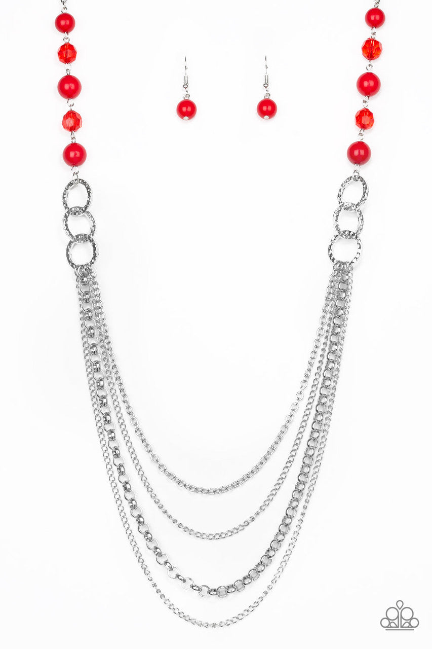 Polished red, faceted crystal-like and delicately hammered silver hoops give way to mismatched silver chains down the chest for a whimsical look. Features an adjustable clasp closure.