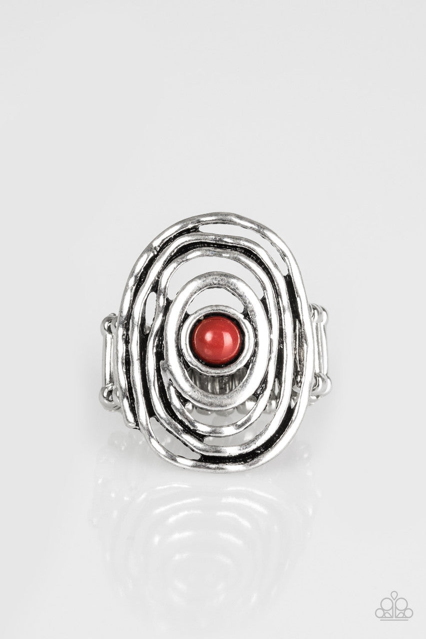 A robust Chili Oil bead dots the center of delicately hammered silver bars rippling into a dizzying frame atop the finger. Features a stretchy band for a flexible fit.
