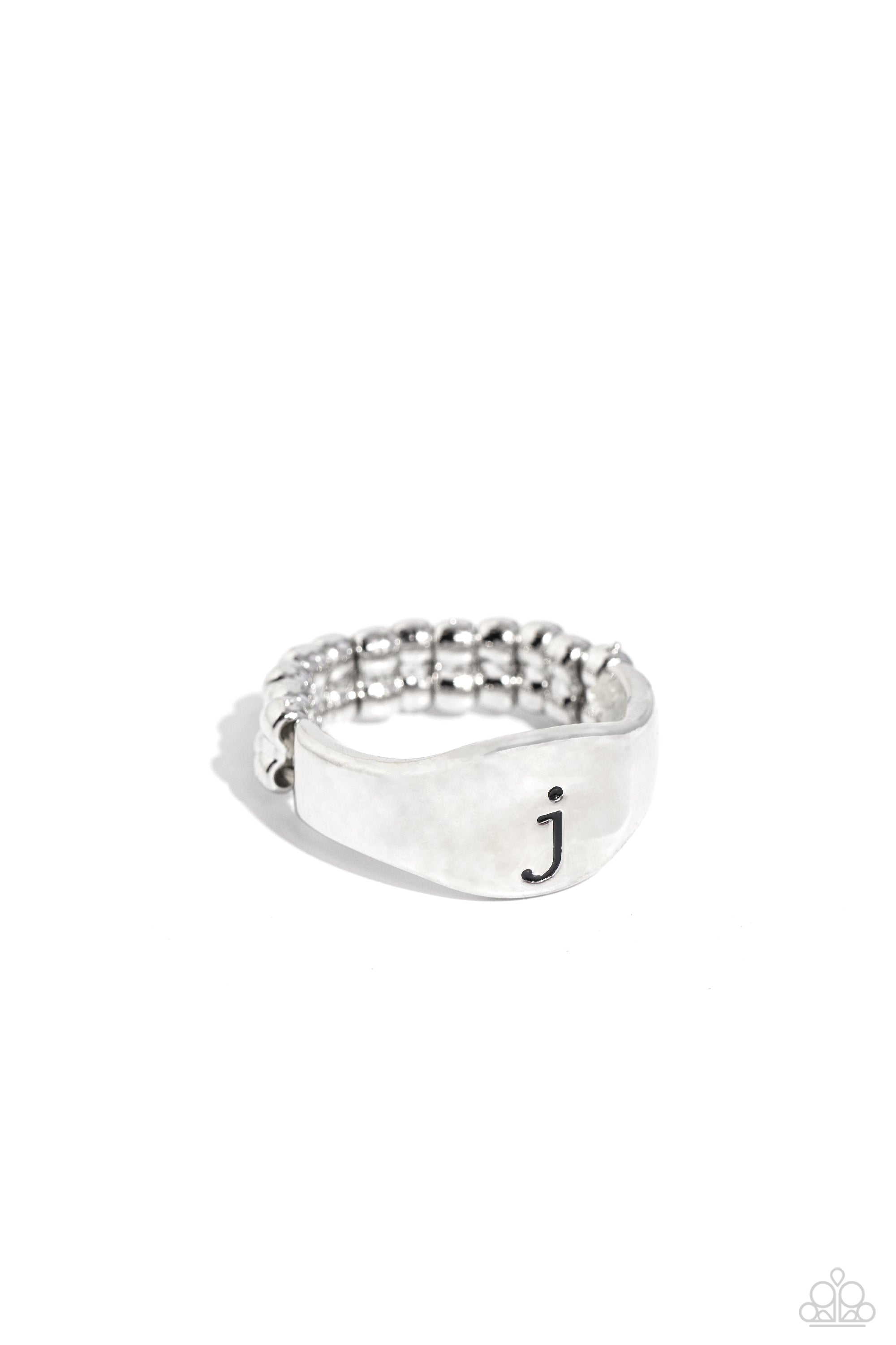 Pressed into the center of a beveled silver band, the black letter "j" stands out for a simple, sentimental centerpiece. Features a stretchy band for a flexible fit.