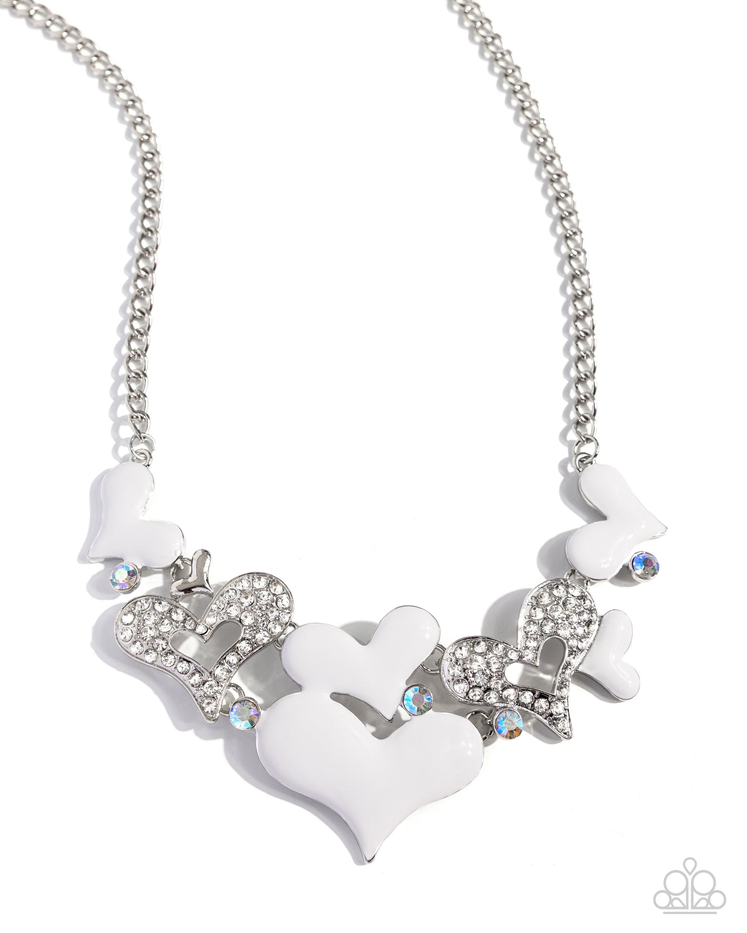 Painted in the vivacious shade of white, a collection of abstract hearts, sleek silver hearts, and white rhinestone-embellished hearts glide across the neckline from a classic silver chain for a romantic array. Solitaire iridescent gems sporadically interrupt the display for additional shimmer and light. Features an adjustable clasp closure. Due to its prismatic palette, color may vary.
