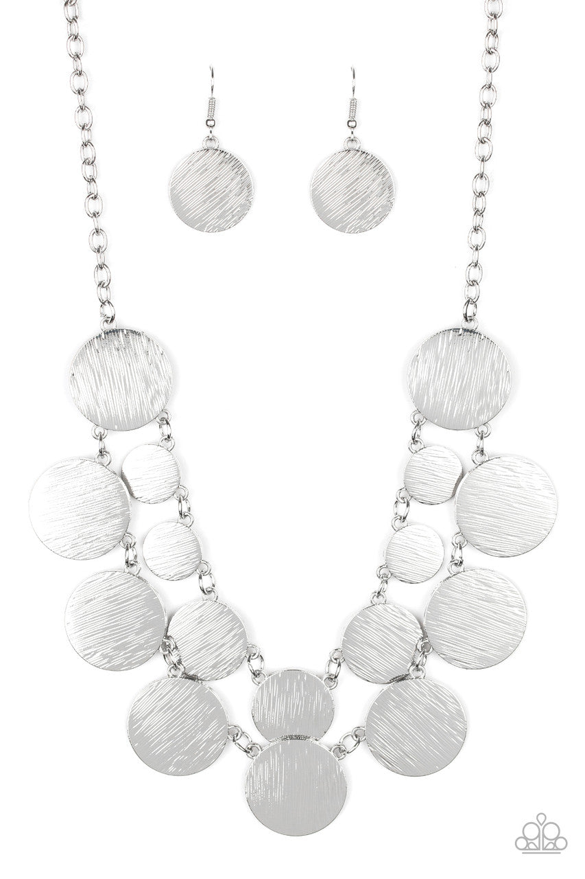 Featuring a blinding scratch shimmer, a collection of shiny silver discs link below the collar, creating radiant rows. Features an adjustable clasp closure.