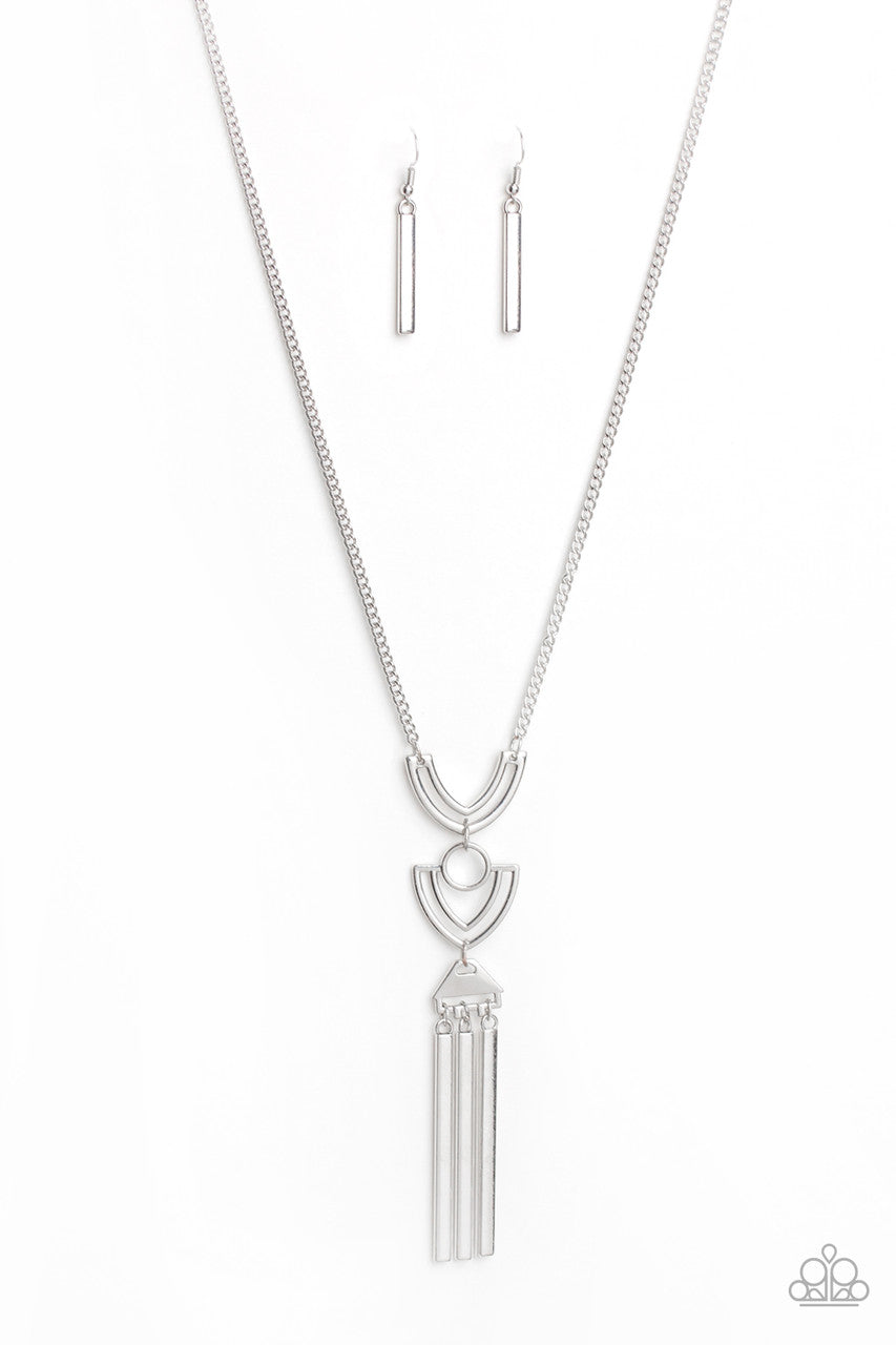 Two airy geometric silver frames link at the bottom of a lengthened silver chain, creating a stacked pendant. Rectangular bars swing from the bottom of the pendant, adding a bold movement to the tribal inspired piece. Features an adjustable clasp closure.