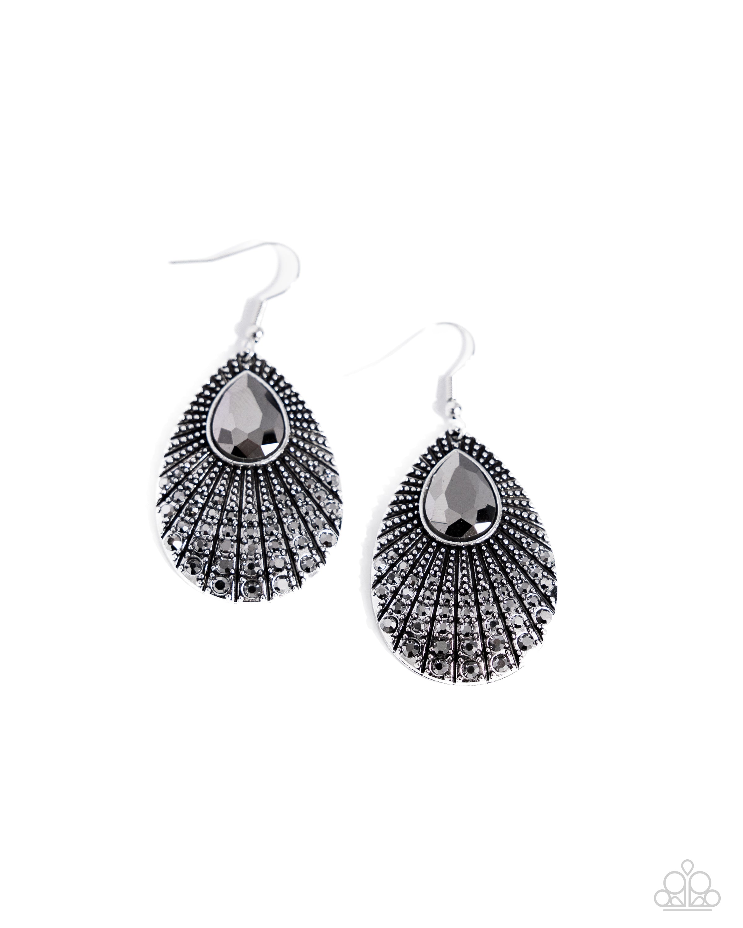 An oversized hematite teardrop rhinestone is pressed into a rustic silver teardrop. Radiating with dainty silver studs, the bottom of the gritty lure is dotted in rows of hematite rhinestones for a glittering finish. Earring attaches to a standard fishhook fitting.