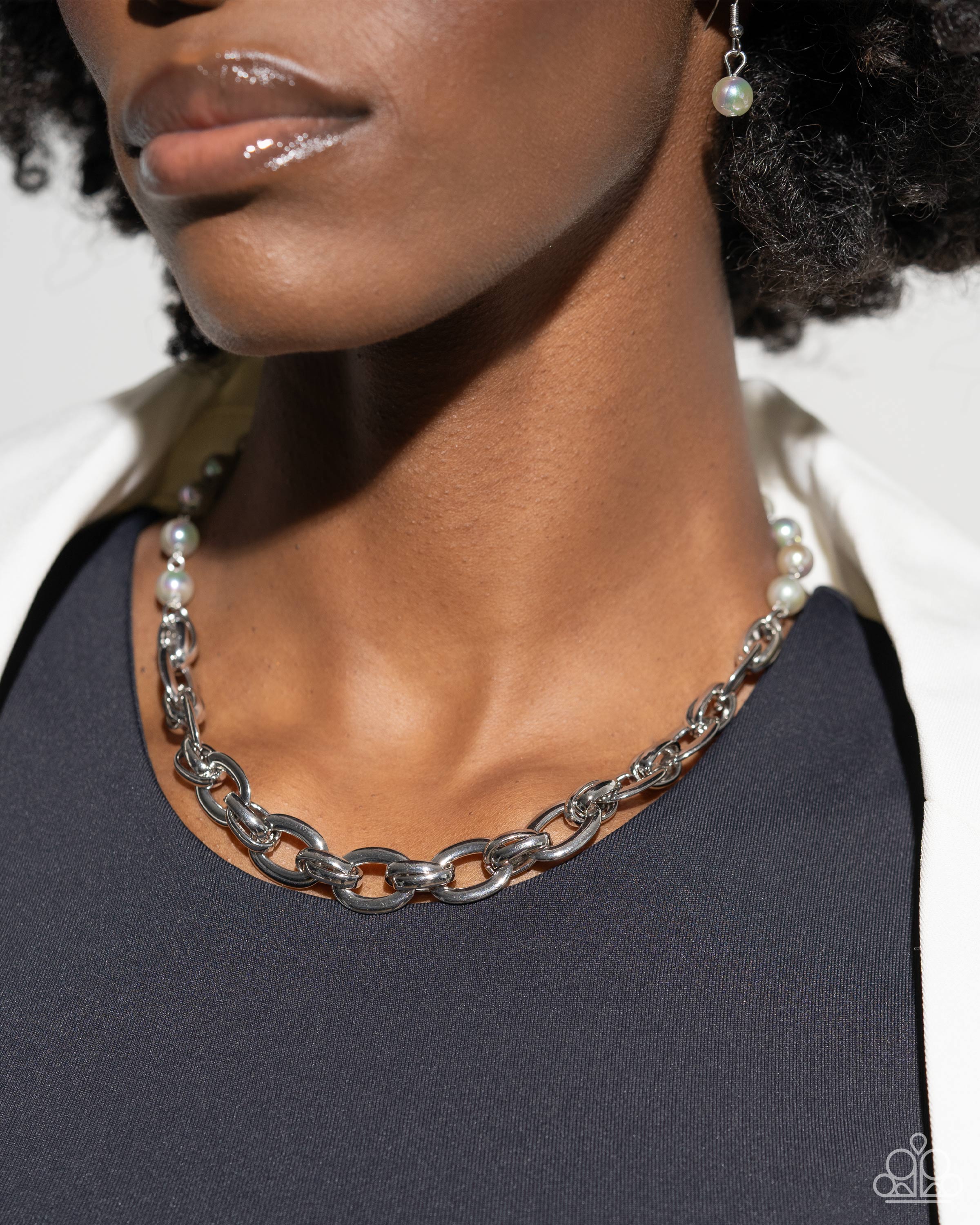 Gleaming white pearls combine with oversized silver links to create a half-and-half fashionable mashup down the neckline for a refined, carefree finish. Features an adjustable clasp closure.