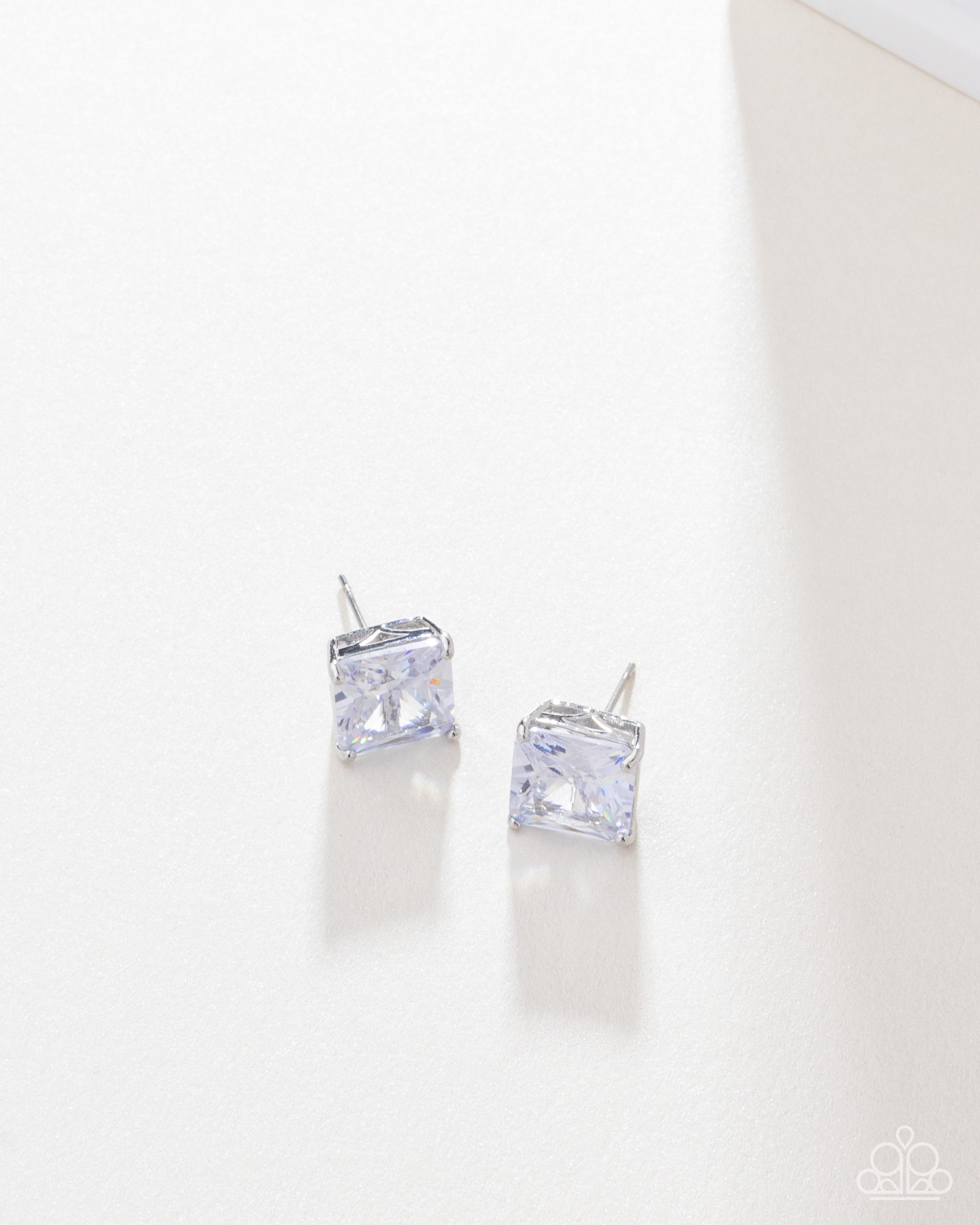 GLOW Time - White - Oversized Princess Cut Gem Paparazzi Post Earrings - Blockbuster