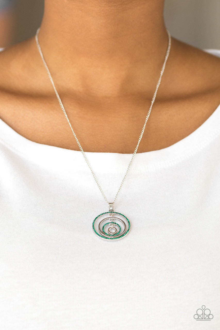 Encrusted in dainty green rhinestones, glittery circular frames alternate with shiny silver frames, creating a dizzying pendant. The sparkling pendant swings from the bottom of a classic silver chain below the collar for a sophisticated fashion. Features an adjustable clasp closure.