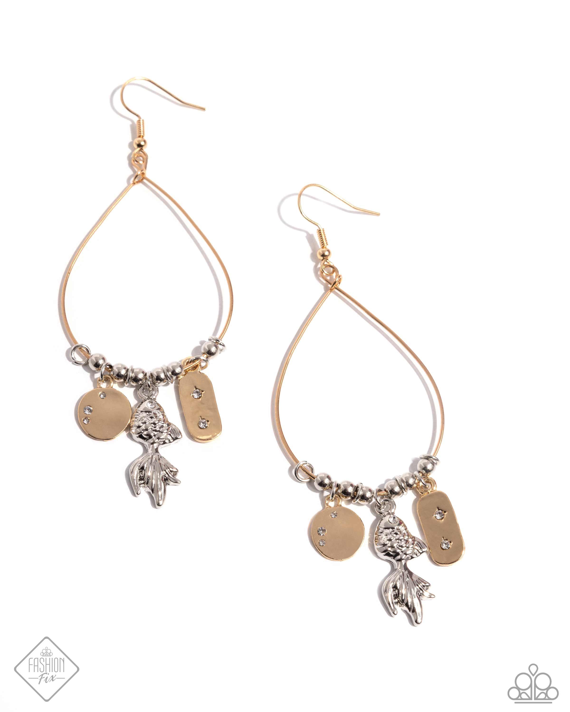 A textured silver goldfish and two gold discs embellished with dainty white rhinestones, one vertical and one round, are threaded along a dainty gold wire that loops into a timely, teardrop hoop. Earring attaches to a standard fishhook fitting.