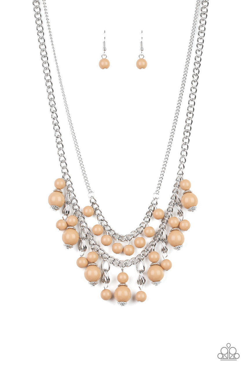 Infused with shimmery silver accents, an array of neutral brown beads cascade from two shimmery silver chains, creating a flirtatious beaded fringe below the collar. Features an adjustable clasp closure.