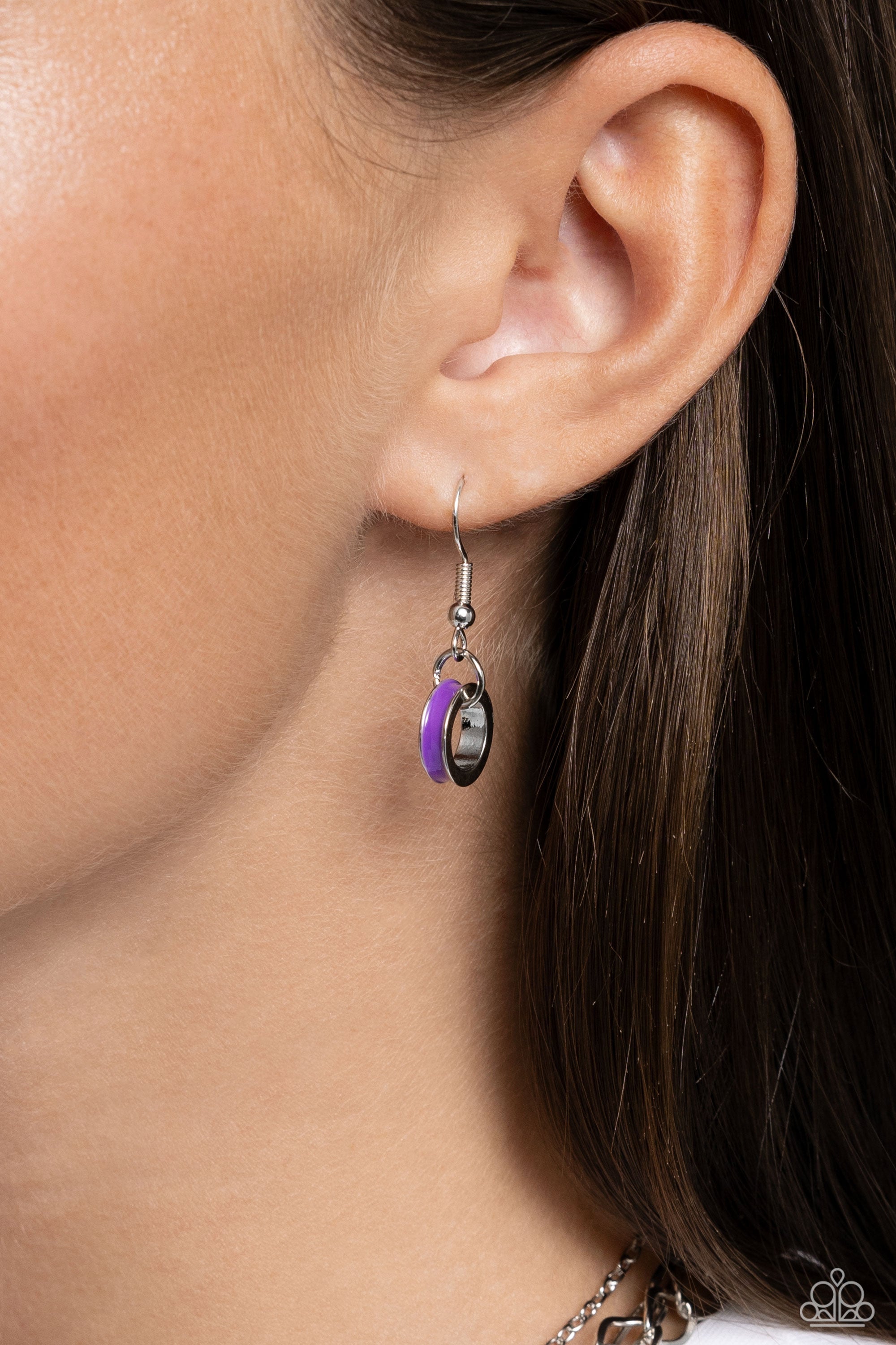 Three mismatched silver chains cascade and layer along the neckline for a sleek look. Strung along the uppermost dainty silver chain, a collection of hot pink, lavender, and purple-painted silver rings add an optimistic splash of color to the look. Features an adjustable clasp closure.