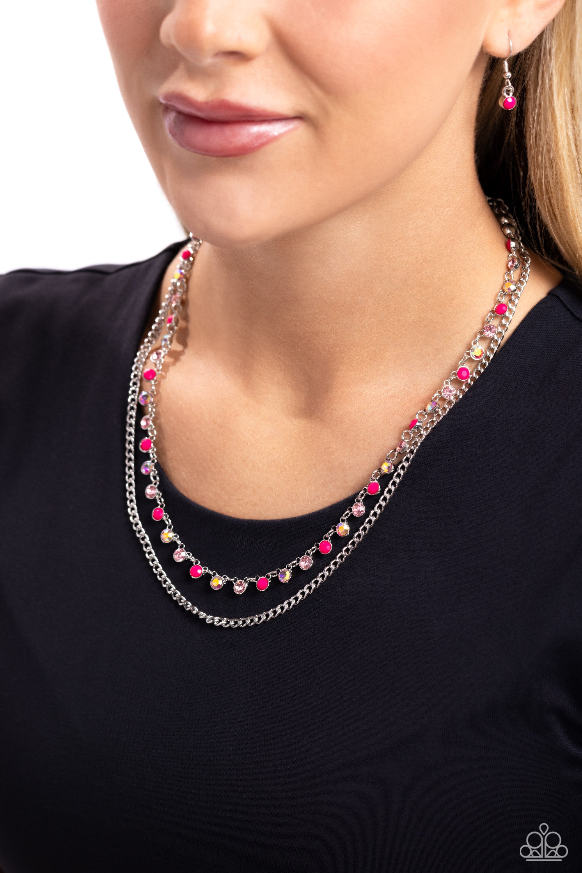 Iridescent, pink rhinestones and Pink Peacock-painted beads alternate and layer beside a classic silver chain for a colorful collision around the collar. Features an adjustable clasp closure. Due to its prismatic palette, color may vary.
