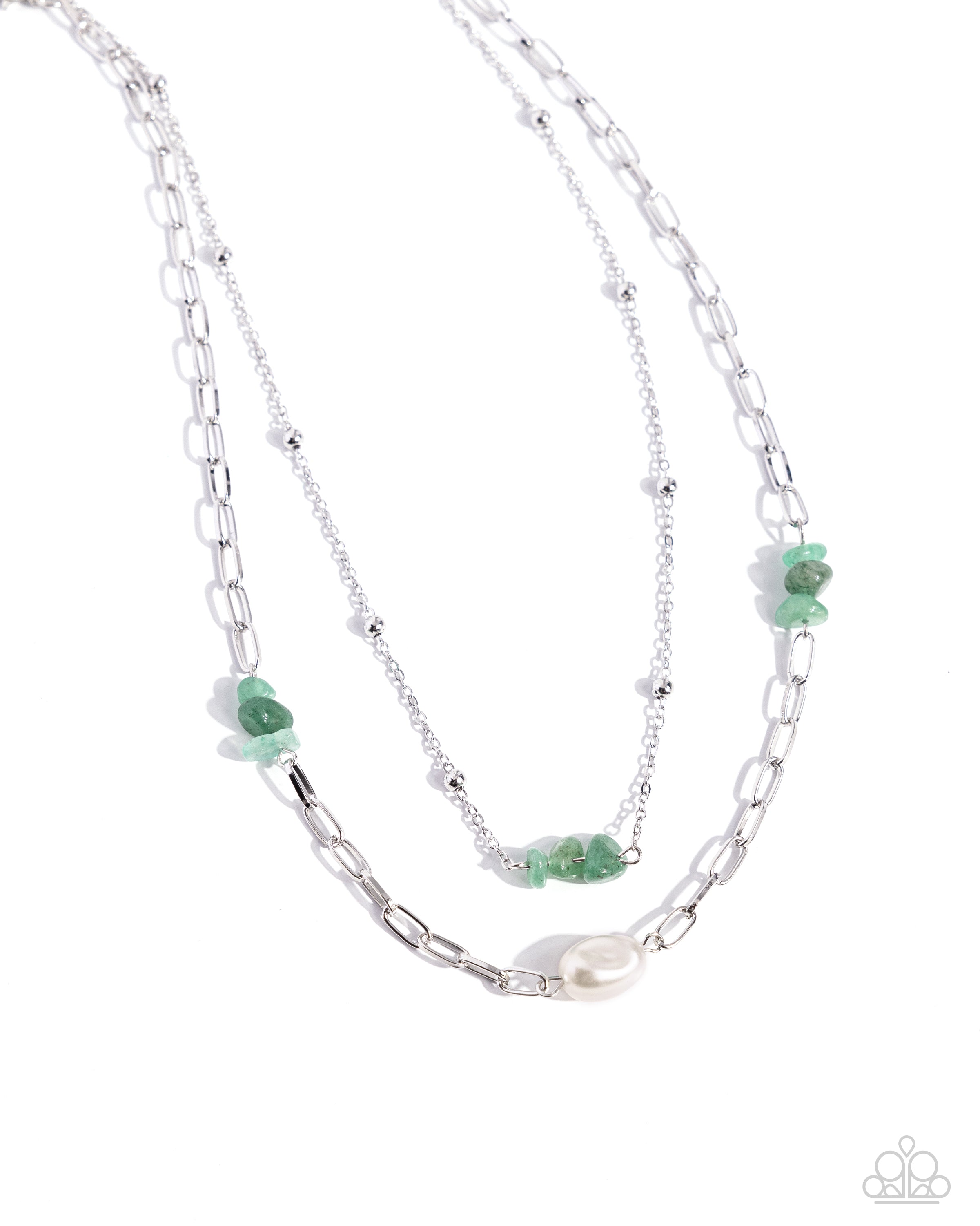 Infused along a silver paperclip and satellite chain, a collection of chiseled jade stones and a baroque white pearl layer below the collar for a Santa Fe-inspired statement. Features an adjustable clasp closure. As the stone elements in this piece are natural, some color variation is normal.